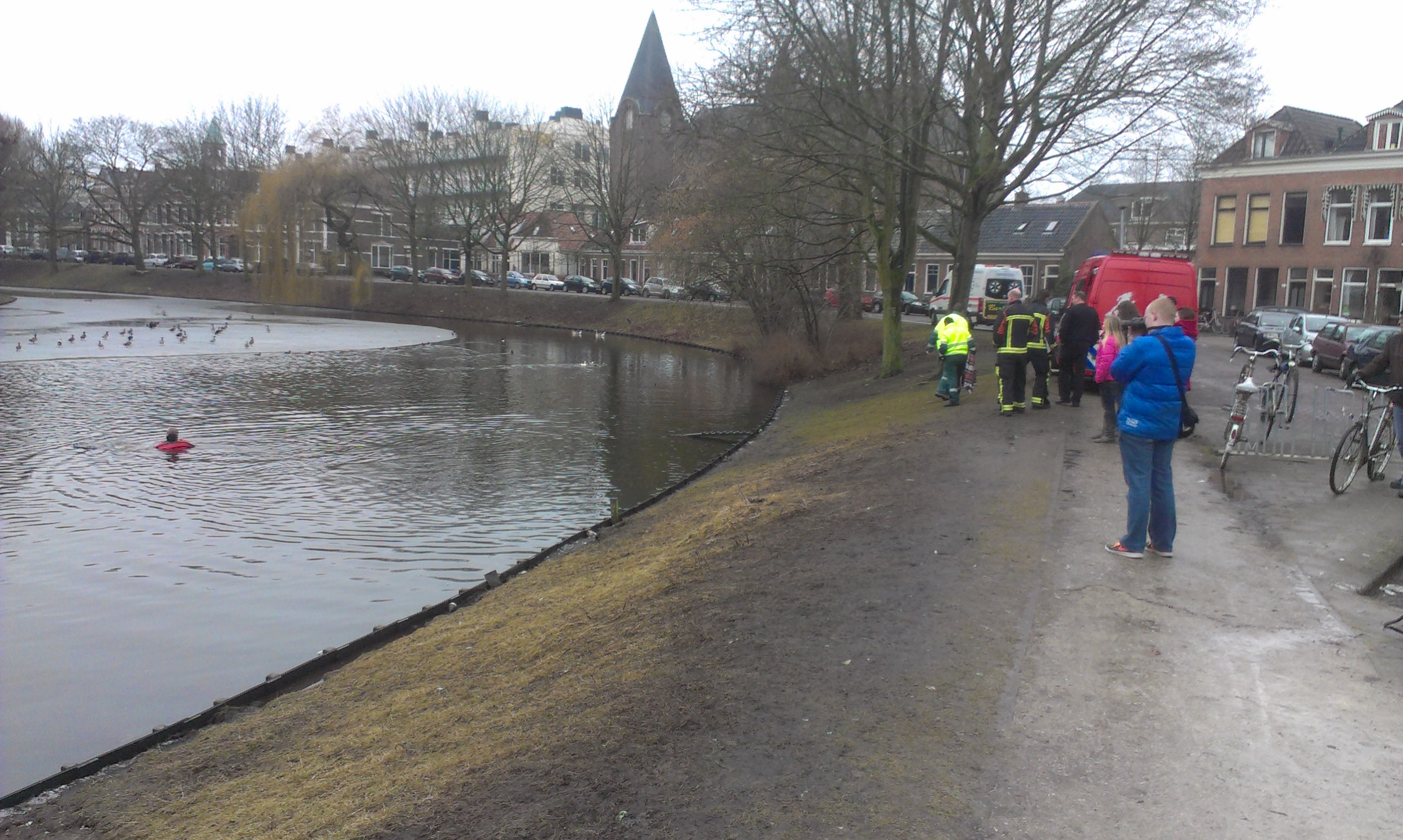 Een gewonde gans in de Noorderplantsoenvijver liet zich vrijdagmiddag niet zo maar vangen. Zelfs de inzet van een duiker van de brandweer hielp niet. Die zakte diverse keren door het dunne ijs.