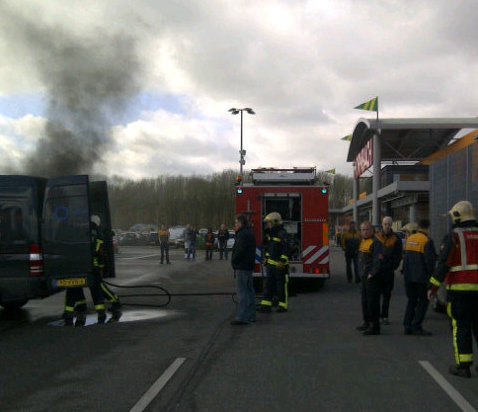 Er is donderdagmiddag brand ontstaan in een bestelbusje op de parkeerplaats van Hornbach aan de Groningerweg.