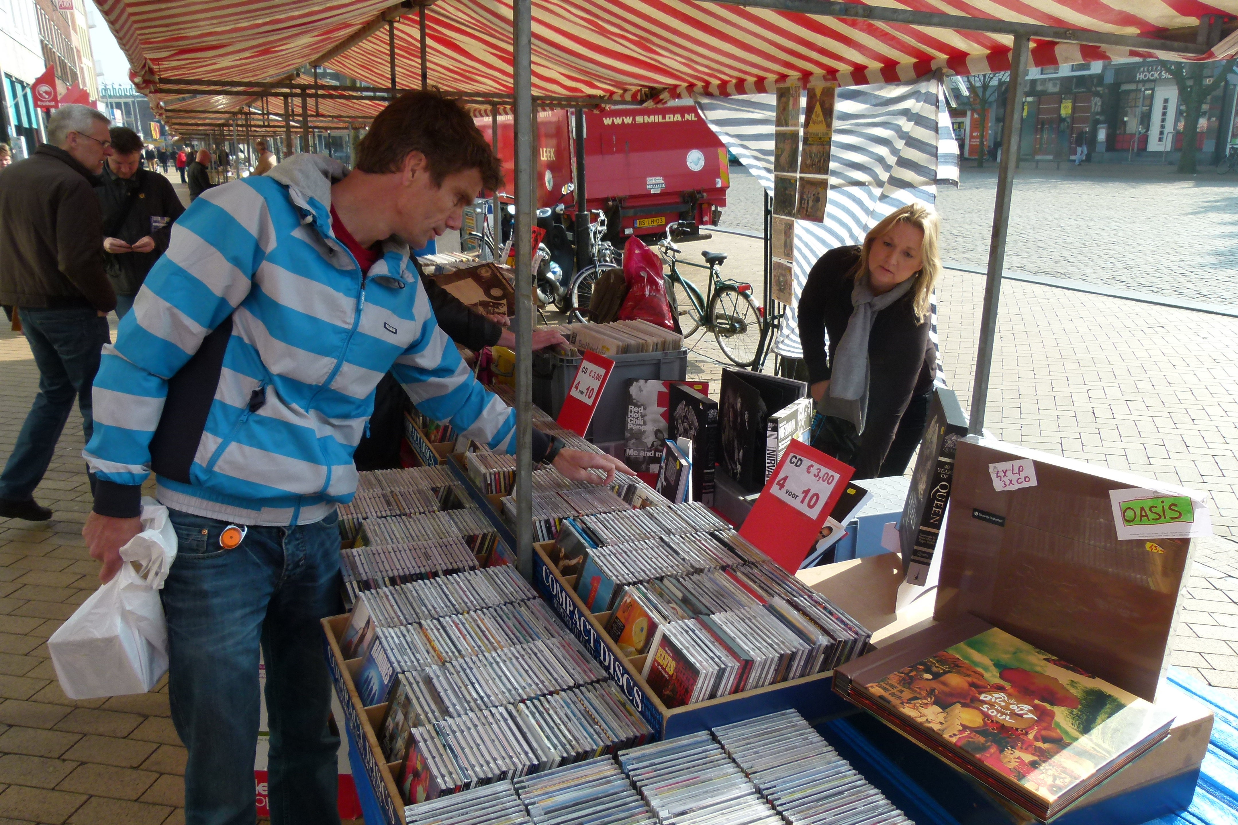 Zo’n vijftien standhouders hadden hun platen, cd’s en dvd’s uitgestald op het plein boven de parkeergarage. “Eerder stonden we nog op de Vismarkt. Op de huidige locatie heb je geen winkelend publiek dat even blijft kijken. Dat speelt ook mee in het aantal bezoekers.”, zo betoogde standhouder Rob van Veenendaal.