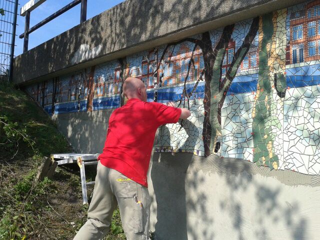 Er werd in de Moestraat dinsdagochtend gewerkt aan een vervrolijking van het spoorviaduct met een mozaïek. Het Mozaïek is gemaakt door de buurtbewoners in samenwerking met kunstenaar Jacqueline Smid.