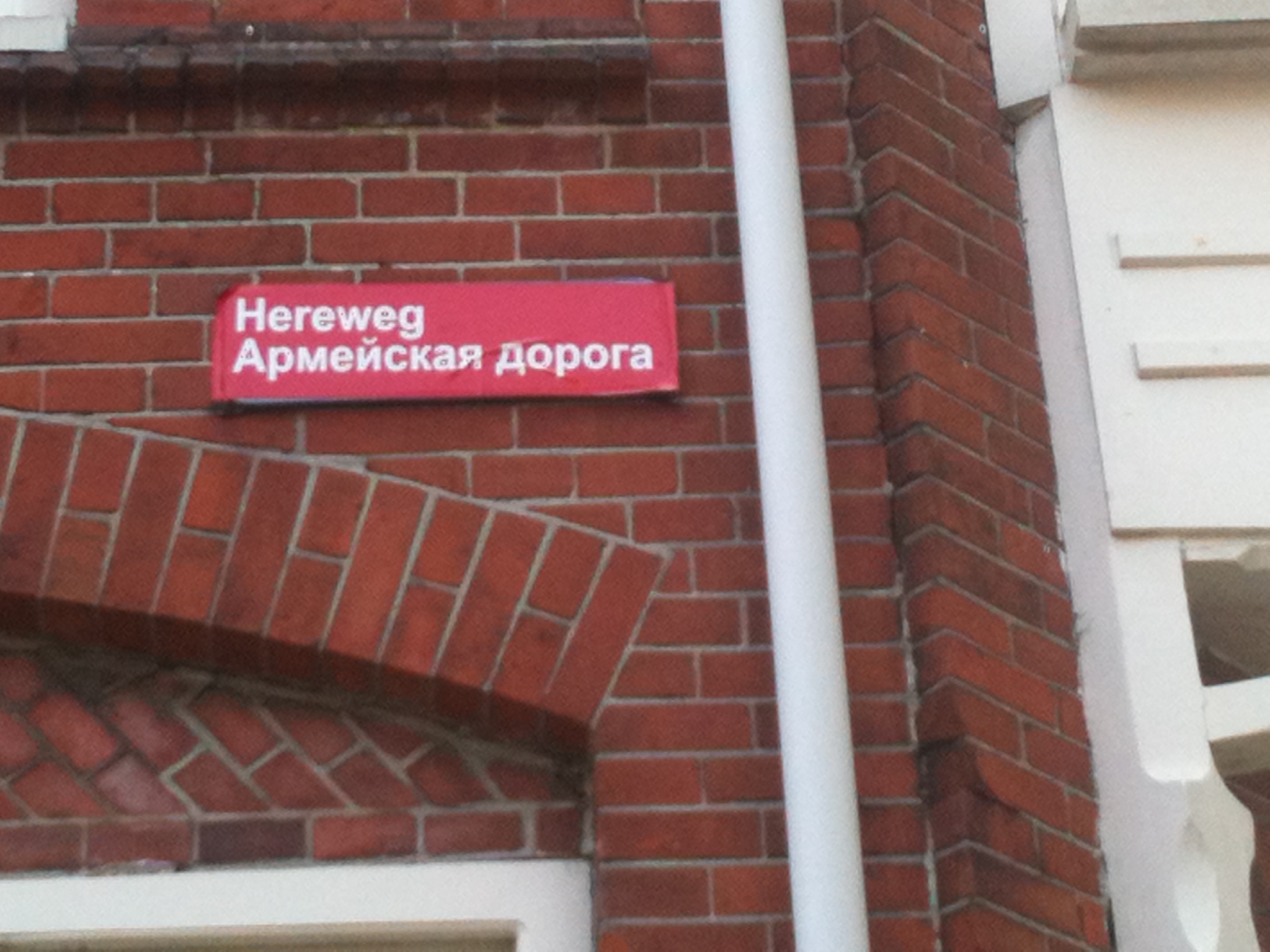 Hier in de Rivierenbuurt is een discussie ontstaan over de betekenis van het Russisch op het straatnamenbordje. Armeense weg lijkt er te staan, maar dat strookt niet erg met 'Hereweg'. Is het een vertaalfout? Of een grap? Een interessante bijdrage verwijst naar een oudere betekenis van 'heer' dat leger zou betekenen. Leuk. Een beetje taalreuring in de wijk. Als vertaalbureau in deze wijk kunnen wij de laatste lezing ondersteunen. Onze goede contacten in Rusland hebben dit bevestigd.
