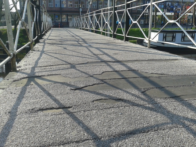 De houten planken waar de slijtlaag overheen ligt, werden in het voorjaar van 2012 vervangen. Doordat er in de nieuwe planken nog veel vocht zit, blijft het mengsel van teer en grind niet goed plakken met gaten in het wegdek als gevolg. Volgens de gemeente komt dit vaker voor bij dergelijke bruggetjes en valt de schade binnen de garantie.