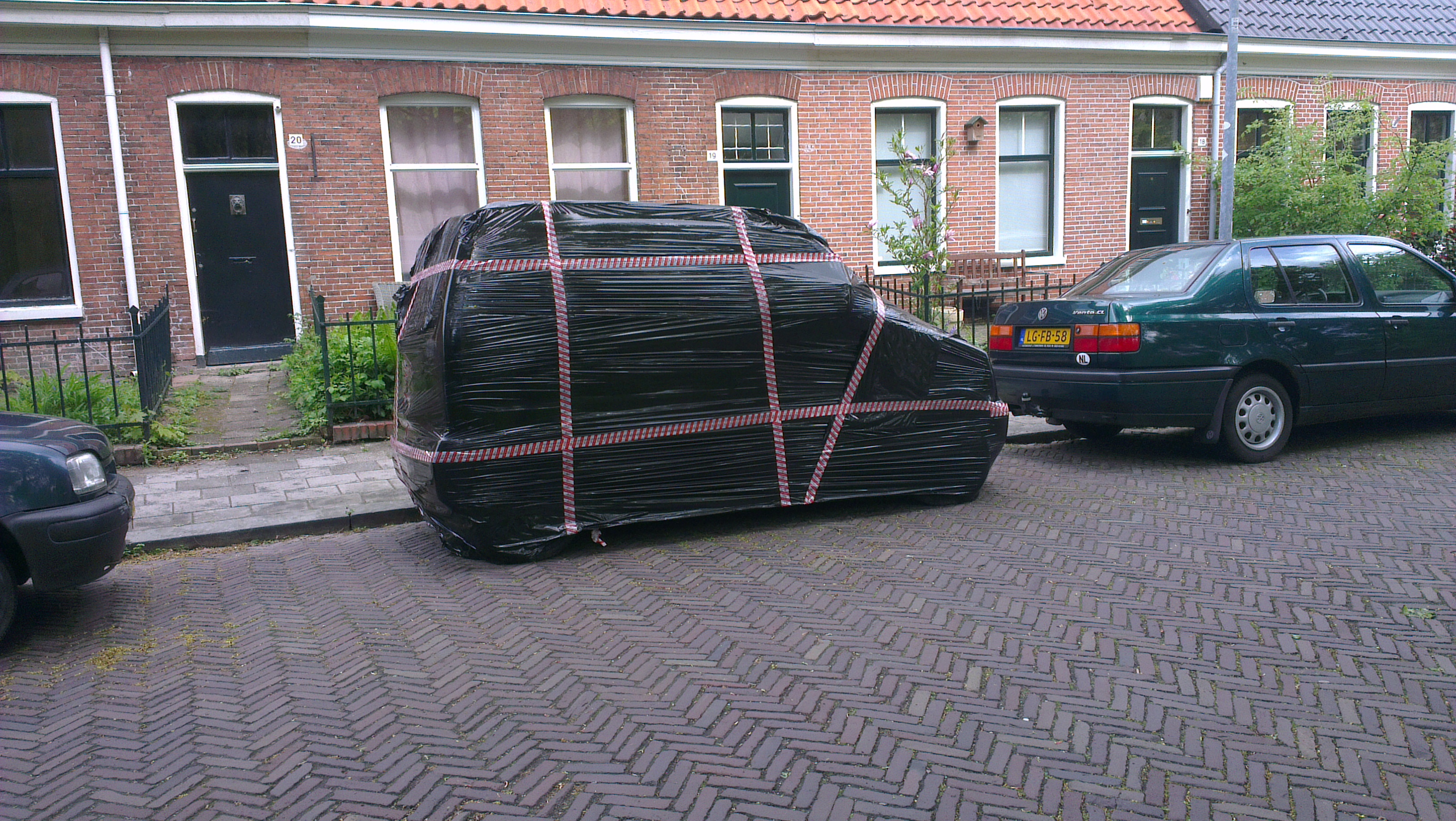Een wel heel bijzondere auto trok dinsdag de aandacht van voorbijgangers in de Noorderbuitensingel. De auto was namelijk helemaal ingepakt met donker plastic en rood-wit gekleurde linten.