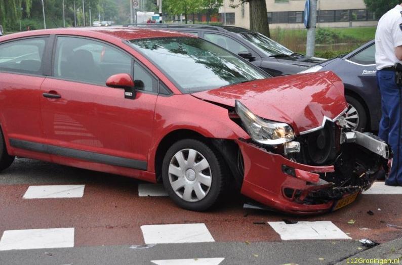 Het ongeluk gebeurde rond 20.00 uur. Een rode personenauto wilde afslaan, maar zag daarbij een donkerblauwe auto over het hoofd. Het gevolg was een aanrijding, waarbij beide auto’s fors beschadigd raakten.