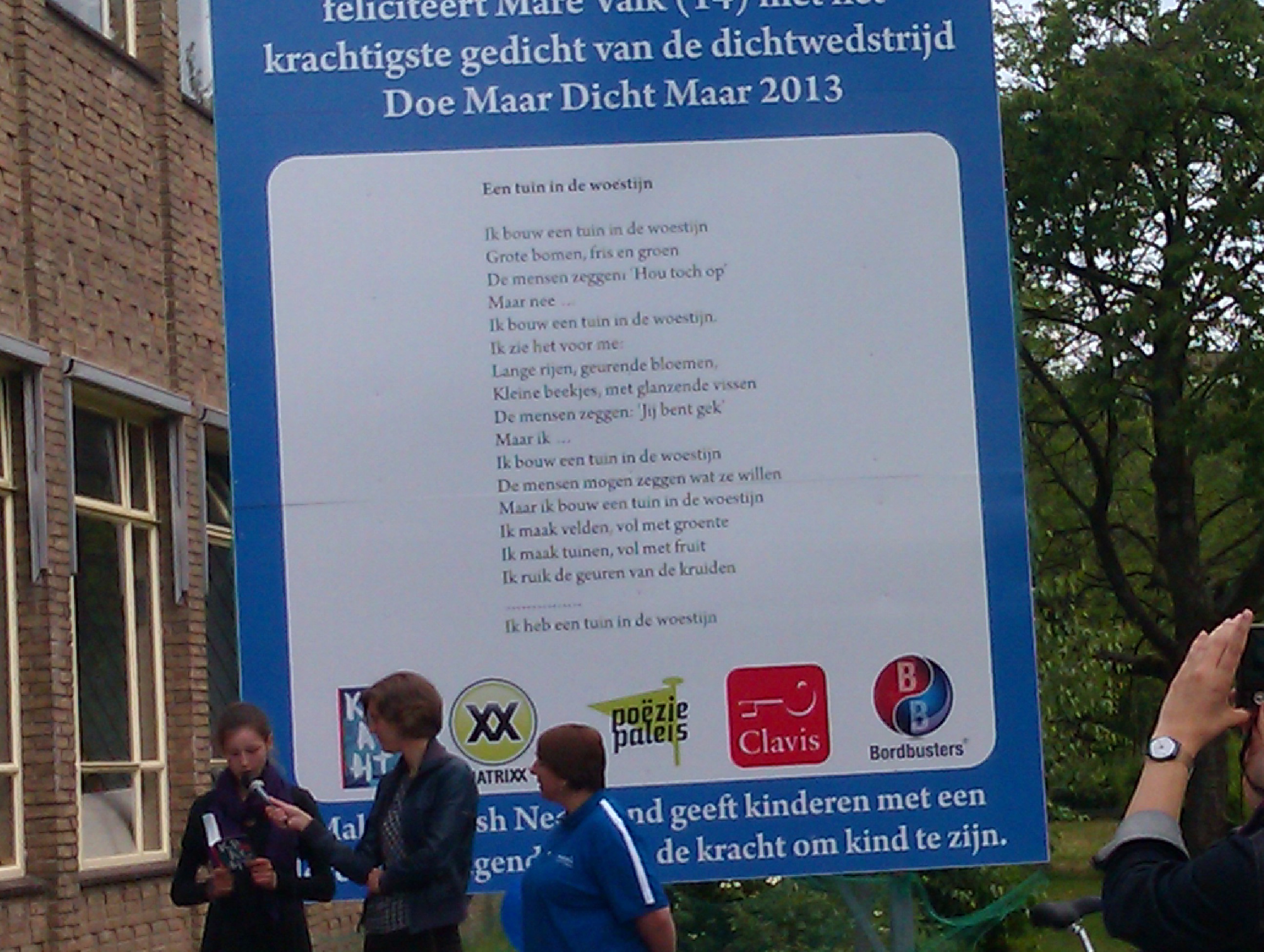 Make-A-Wish vervult wensen van kinderen met een levensbedreigende ziekte. Jongeren konden in het kader van Doe Maar Dicht Maar een gedicht rond het thema ‘Kracht’ insturen. Volgens de jury wist Mare met haar gedicht Een tuin in de Woestijn pakkend te verwoorden hoeveel kracht, kinderen die ernstig ziek zijn hebben om door te blijven vechten.