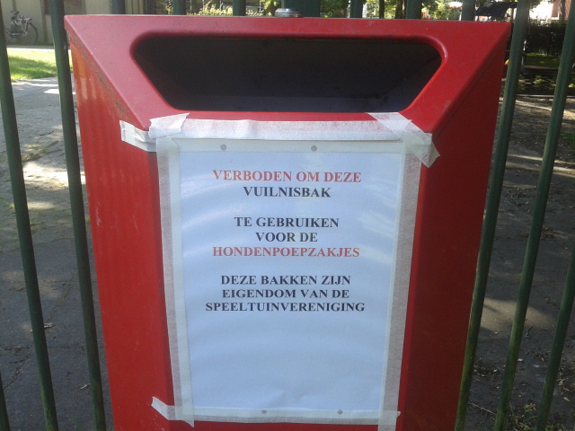 Hondenbezitters zijn verplicht om de feces van hun huisdier op te ruimen. In de Oosterparkwijk doen veel baasjes dit trouw en dumpen de uitwerpselen in de dichtstbijzijnde prullenbak. Helaas voor de speeltuinvereniging aan de Oliemuldersweg, is dit vaak hun prullenbak. Omdat de stank op een gegeven moment niet meer te harden was, is het probleem aangekaart bij de gemeente. De gemeente gaf te kennen dat er geen budget is voor extra prullenbakken.