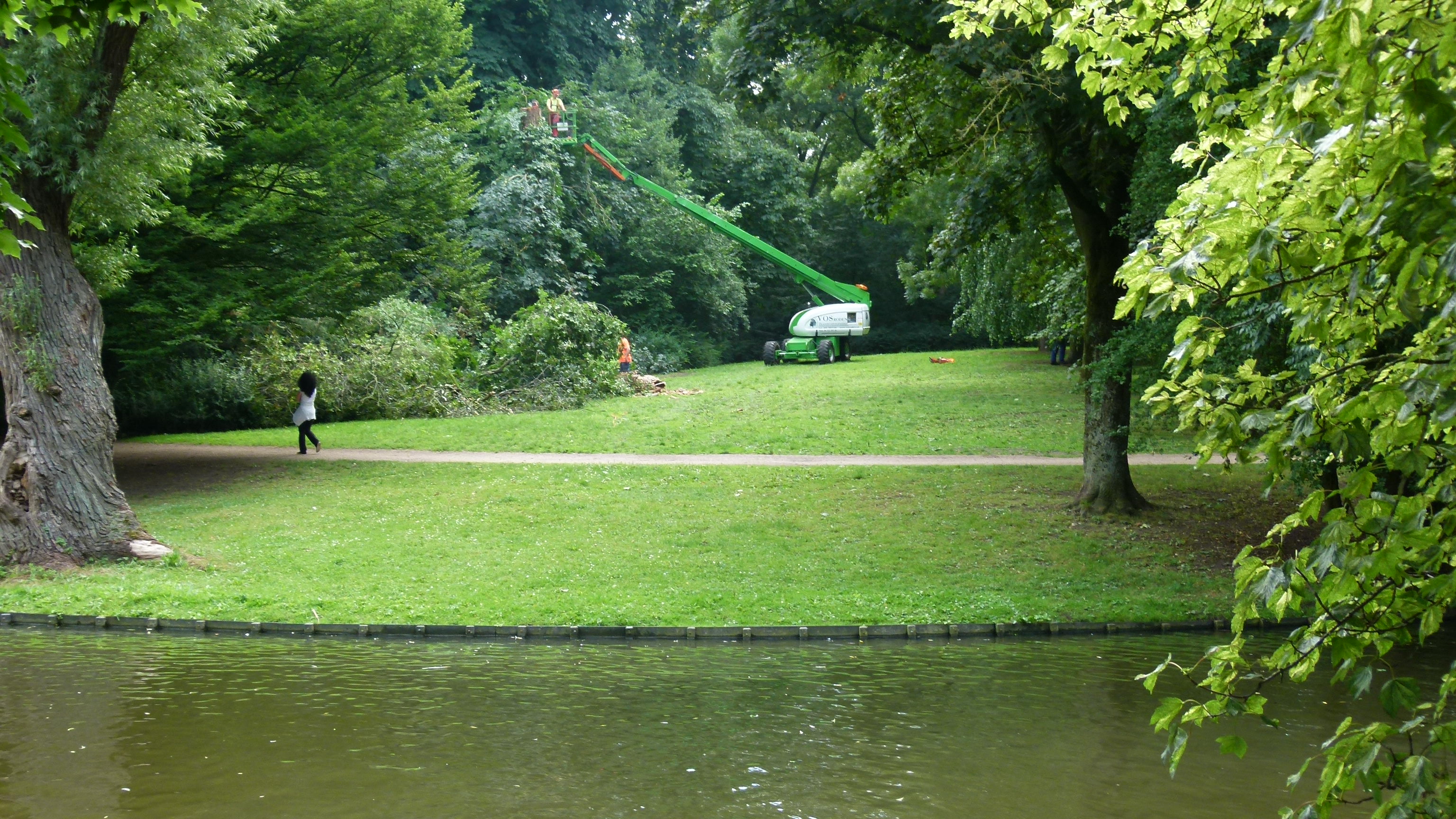 De hoogwerker is nodig om takken in de toppen van de bomen af te zagen. Om te voorkomen dat er ongelukken gebeuren met bezoekers van het plantsoen zijn er waarschuwingsborden geplaatst dat er gewerkt wordt.