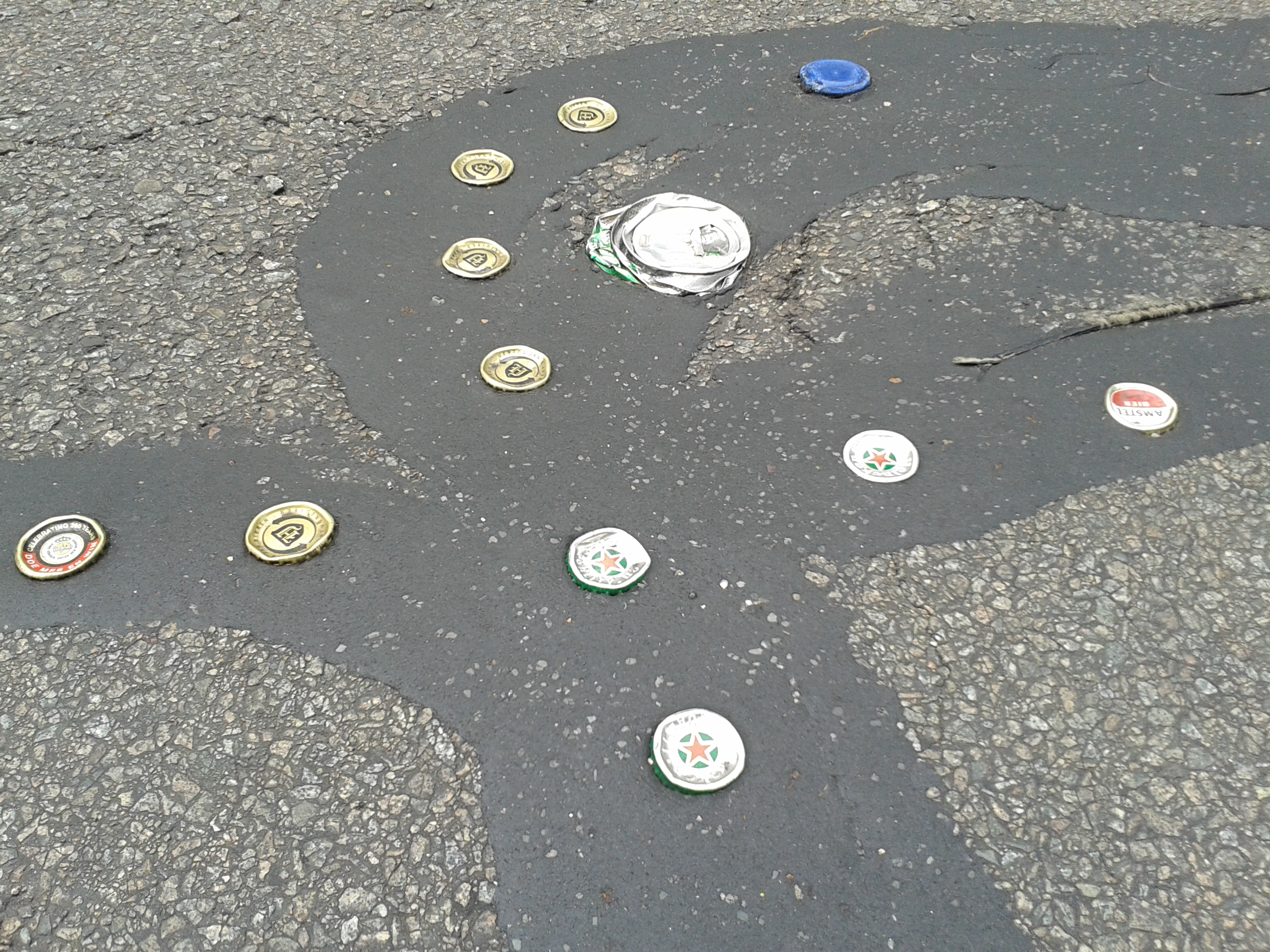 De kroonkurken en een enkel blikje zijn in een lange lijn tussen beide weghelften geplaatst, waardoor het lijkt alsof het een wegafscheiding is.