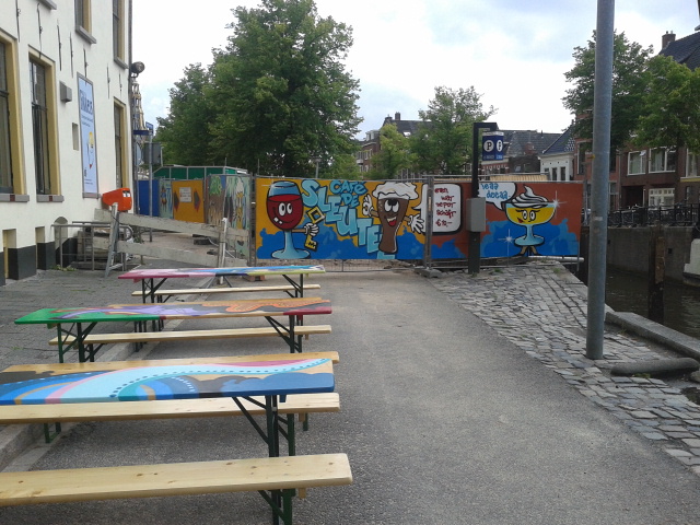 Door de werkzaamheden rond de Visserbrug, is het begin van de Noorderhaven tijdelijk autoloos. Café De Sleutel heeft deze mogelijkheid aangegrepen om haar terrein uit te breiden. Op het verlaten stukje weg zijn zij een terras begonnen. Om de afscheiding met de bouwplaats op te vrolijken, is kunstenaar Mick La Rock aan het werk geweest. Zij heeft kleurrijke graffiti op de houten schotten aangebracht.