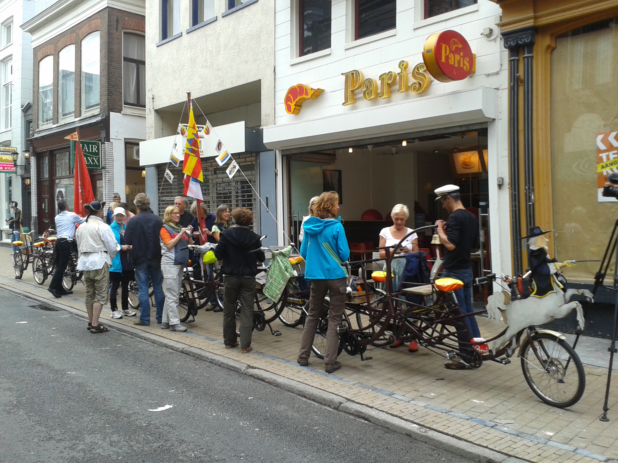 Een zogenaamde fietsboot meerde woensdag aan bij de Duitse ambassade in de Oosterstraat. Het voertuig is een project van de Duitse kunstenaar Michael Olsen uit Oldenburg en biedt plek aan 25 fietsers.