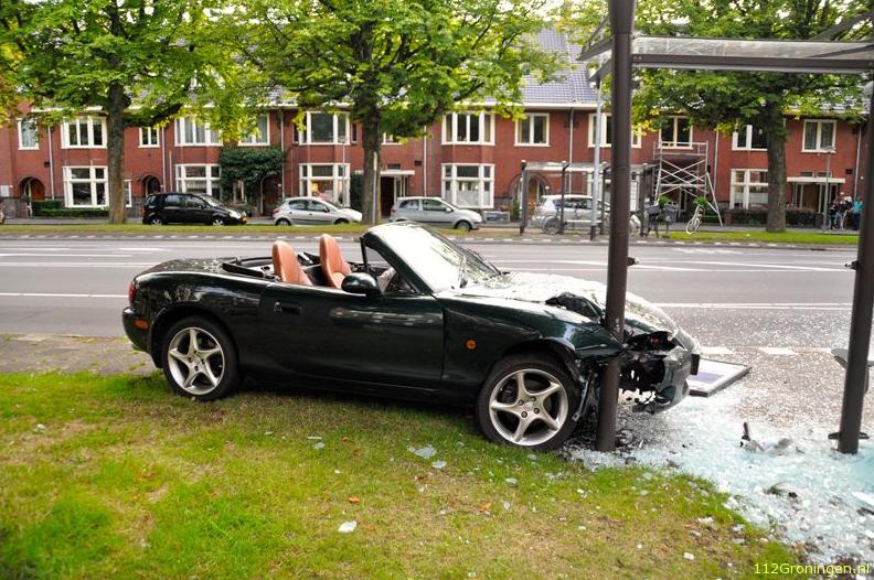 Het ongeluk gebeurde rond 19.50 uur. De bestuurder kwam vanuit de Van Ketwich Verschuurlaan gereden en wilde de Verlengde Hereweg inslaan. Bij deze manoeuvre raakte hij de macht over het stuur kwijt en botste met hoge snelheid tegen een bushokje.