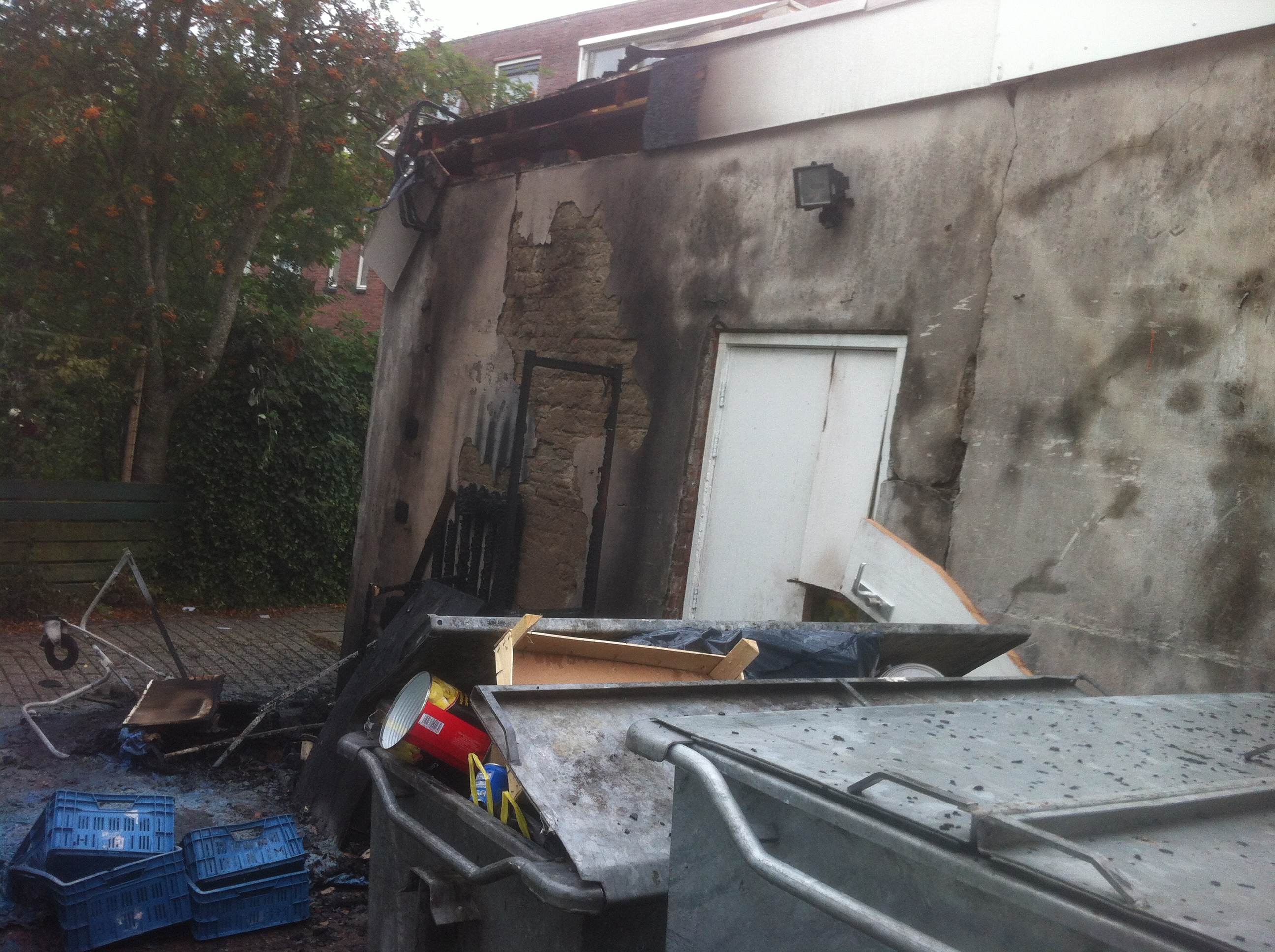 Een korte maar felle brand heeft in de nacht van vrijdag op zaterdag veel schade veroorzaakt aan de achterzijde van een winkel aan de Folkingestraat. Bij de brand raakte niemand gewond.