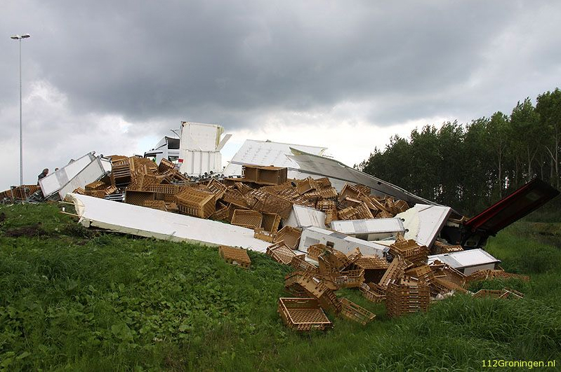 Een vrachtwagen is maandagmiddag op de oprit Westerbroek van de A7 gekanteld en uit elkaar gescheurd. De lading brood en lege broodkratten lag verspreid over de berm.
