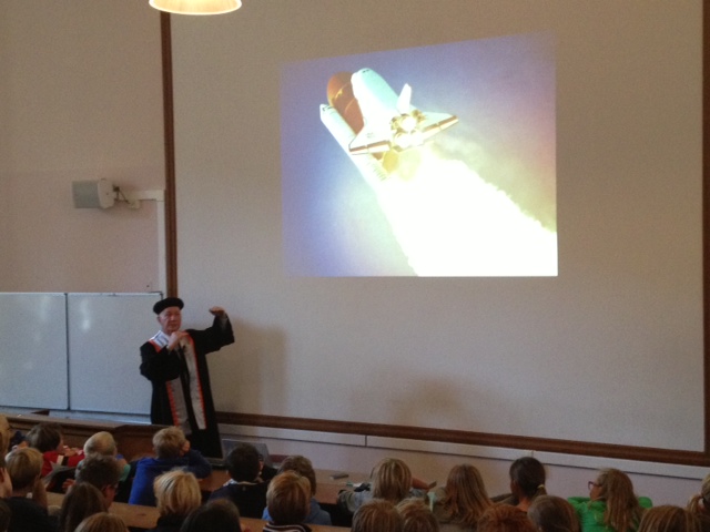Het kindercollege werd druk bezocht en de kinderen waren erg enthousiast. Wubbo Ockels vertelde vooral over zijn ervaringen in de ruimte, het broeikaseffect en het belang van duurzaamheid.