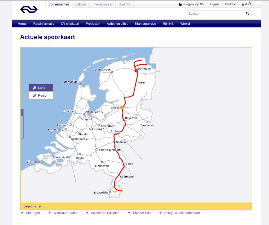 Het kaartje op de website van NS.nl laat een rode lijn zien die van het uiterste Noorden naar Heerlen loopt. Met de rode lijn geeft de vervoerder aan dat reizigers op alle ingekleurde lijnen rekening moeten houden met vertraging en uitval van treinen als gevolg van de kapotte brug. Gelukkig wordt de soep minder heet gegeten, dan ze opgediend wordt. Door het defect is er alleen geen treinverkeer mogelijk tussen Groningen en Groningen Noord.