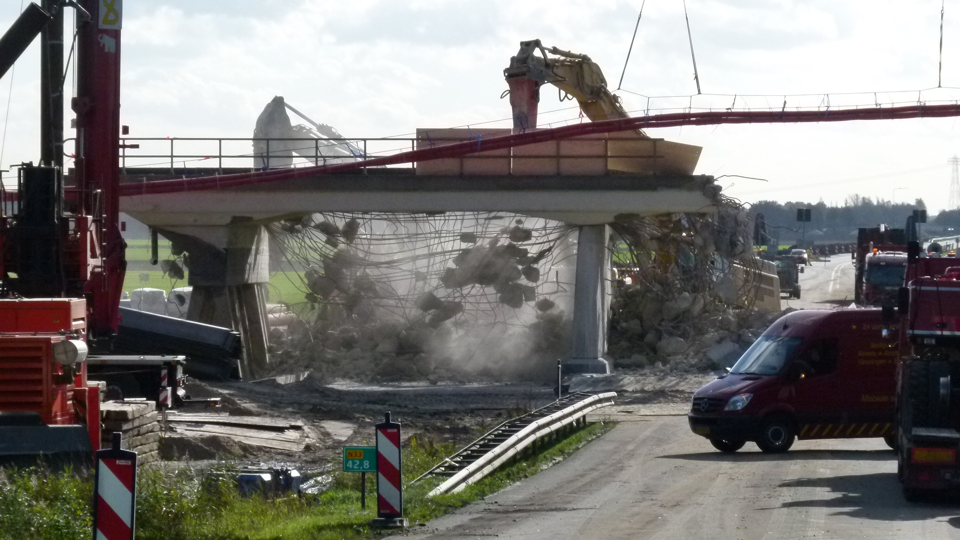 De werkzaamheden aan de spoorbrug over de N33 bij Zuidbroek verliepen in de nacht van woensdag op donderdag niet helemaal volgens schema. Even na 22.00 uur zag men dat één van de landhoofden verzakte.