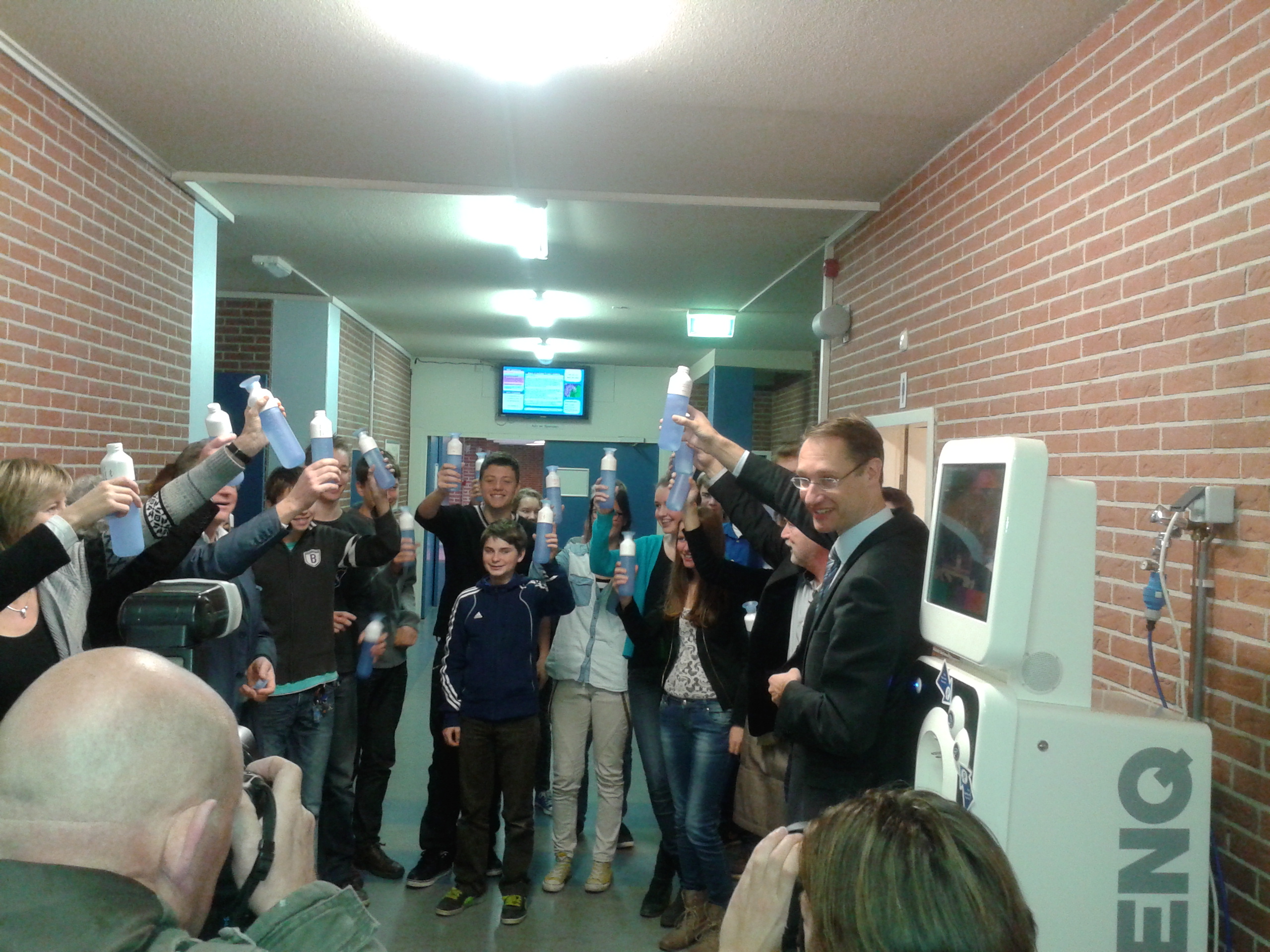 Het was een feestelijke bijeenkomst. Leerlingen van de atheneum 3 klassen zijn al een week bezig met het project ‘Dorstlessen’. Hierbij hebben ze zich afgevraagd hoe alle leerlingen van de school gestimuleerd kunnen worden om water te drinken in plaats van frisdrank en hoe ‘de dopper’ over een langere periode goed gebruikt blijft.