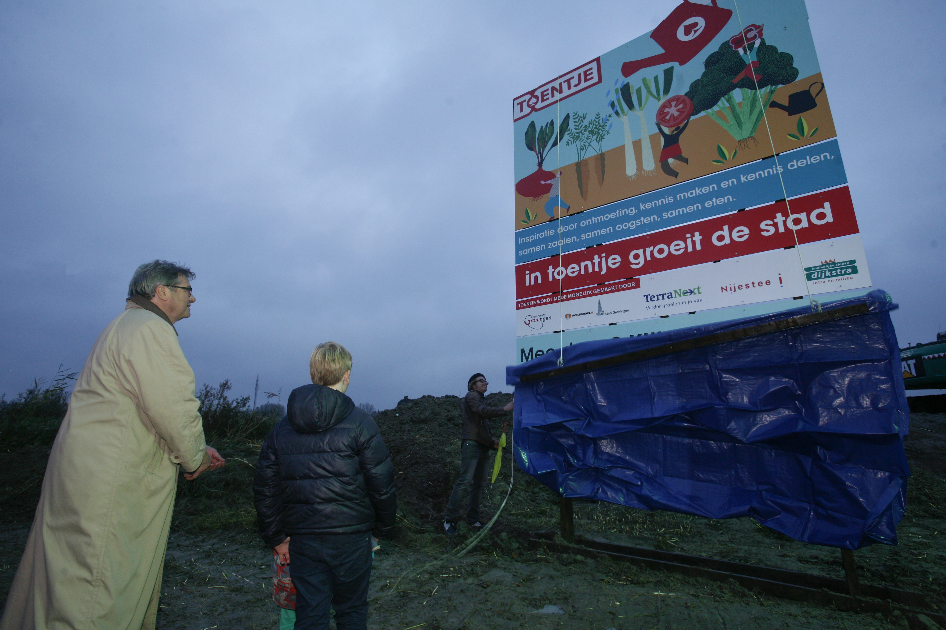 De tuin, ’toentje’ geheten, ligt op een braakliggend terrein dat door woningcorporatie Nijestee in bruikleen is gegeven. Door groente en fruit te verbouwen kunnen mensen zonder baan er ook werkervaring op doen.
