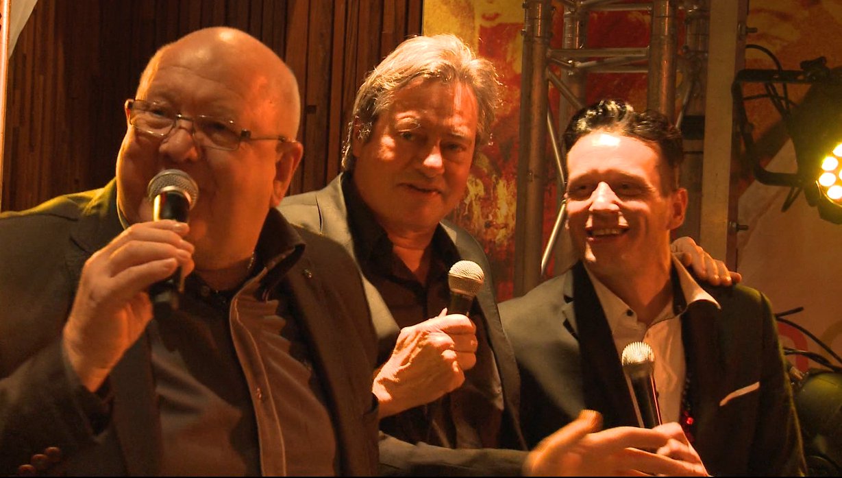 Henk Wijngaard zingt met wethouder Dig Ishta en nachtburgemeester Chris Garrit.