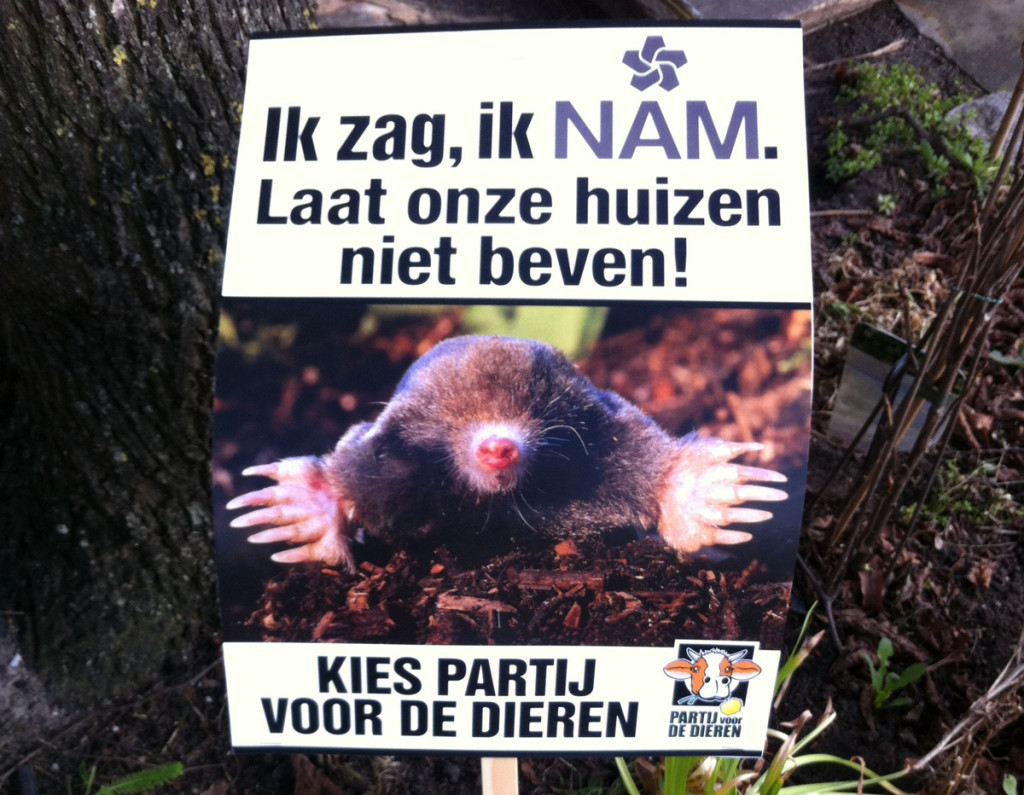 De Partij voor de Dieren heeft woensdagavond het startsein gegeven voor de campagne voor de gemeenteraadsverkiezingen door in de hele stad borden te verspreiden met een mol die protesteert tegen de gevolgen van de gaswinning.
