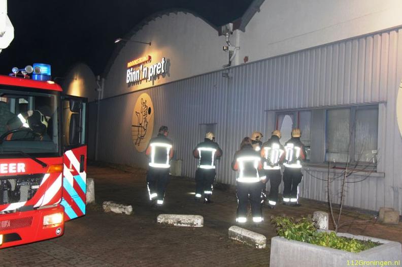 Even na 22.00 uur komt er een melding binnen op de meldkamer waarin een voorbijganger spreekt van forse rookontwikkeling uit het dak van het pand. De Groninger brandweer rukt daarop uit met een bluswagen en een hoogwerker.