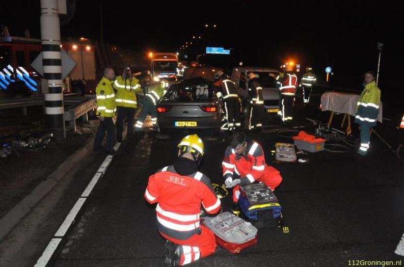 Het ongeluk vond plaats rond 20.45 uur. De beide slachtoffers zaten in de auto van een 37-jarige Groningse die vanuit de richting Hoogkerk linksaf wilde slaan richting het Emmaviaduct. Dit is al jaren niet meer mogelijk. Een 50-jarige man uit Kollumerzwaag kon hen niet meer uitwijken. Behalve de brandweer en twee ambulances kwam ook het Mobiel Medisch Team ter plaatse. De brandweer wist de vrouw na een ruim een half uur uit haar benarde positie te bevrijden. Ze is zwaargewond overgebracht naar het ziekenhuis.
