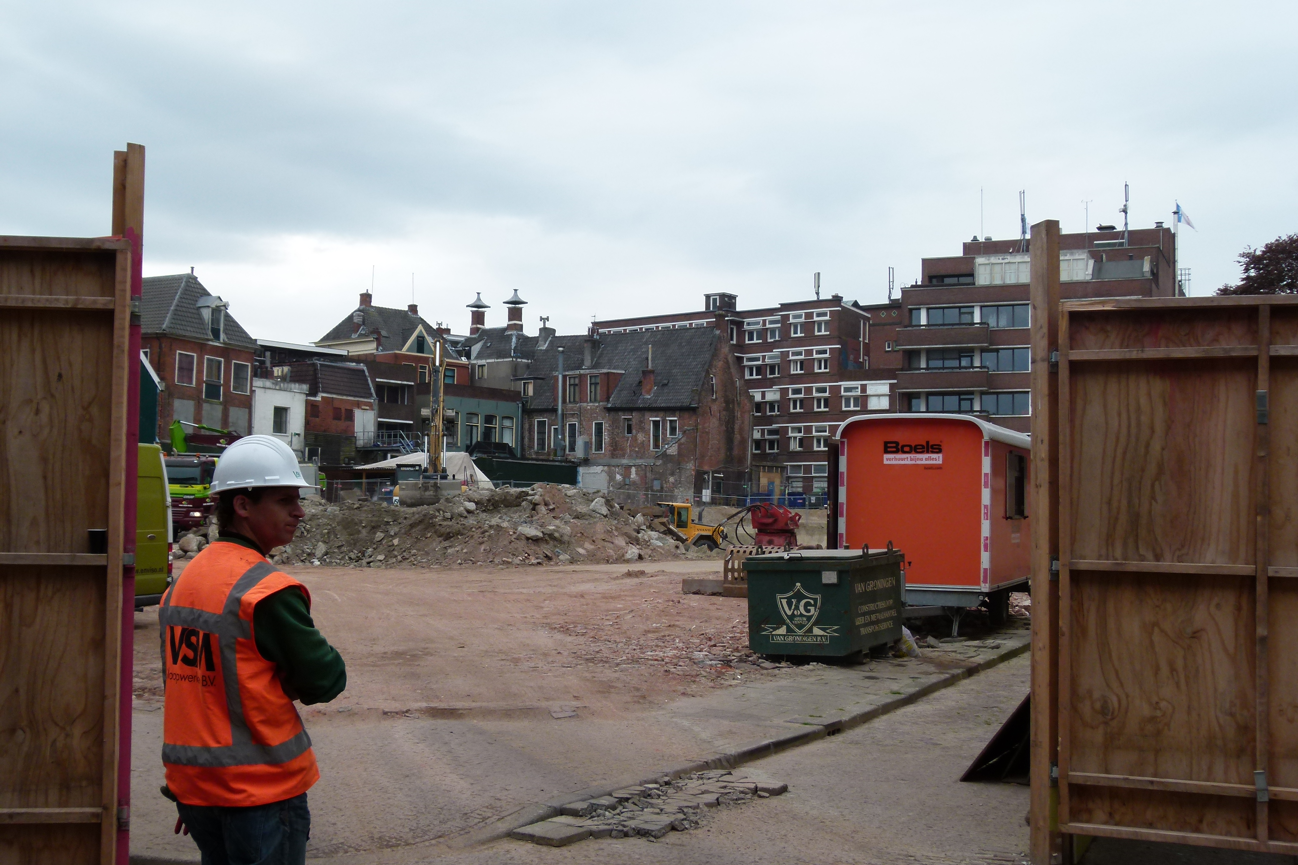 De prachtige bebouwing (de bebouwing boven helm van de bouwvakker tot de achterkant van Springs)gaat afgezien van het vierhonderd jaar oude gebouw* dat tegen de Springs achterkant aan)staat, verdwijnt voor bagger van het zoontje van Jurjen van der Meer (Zwarte Hond).