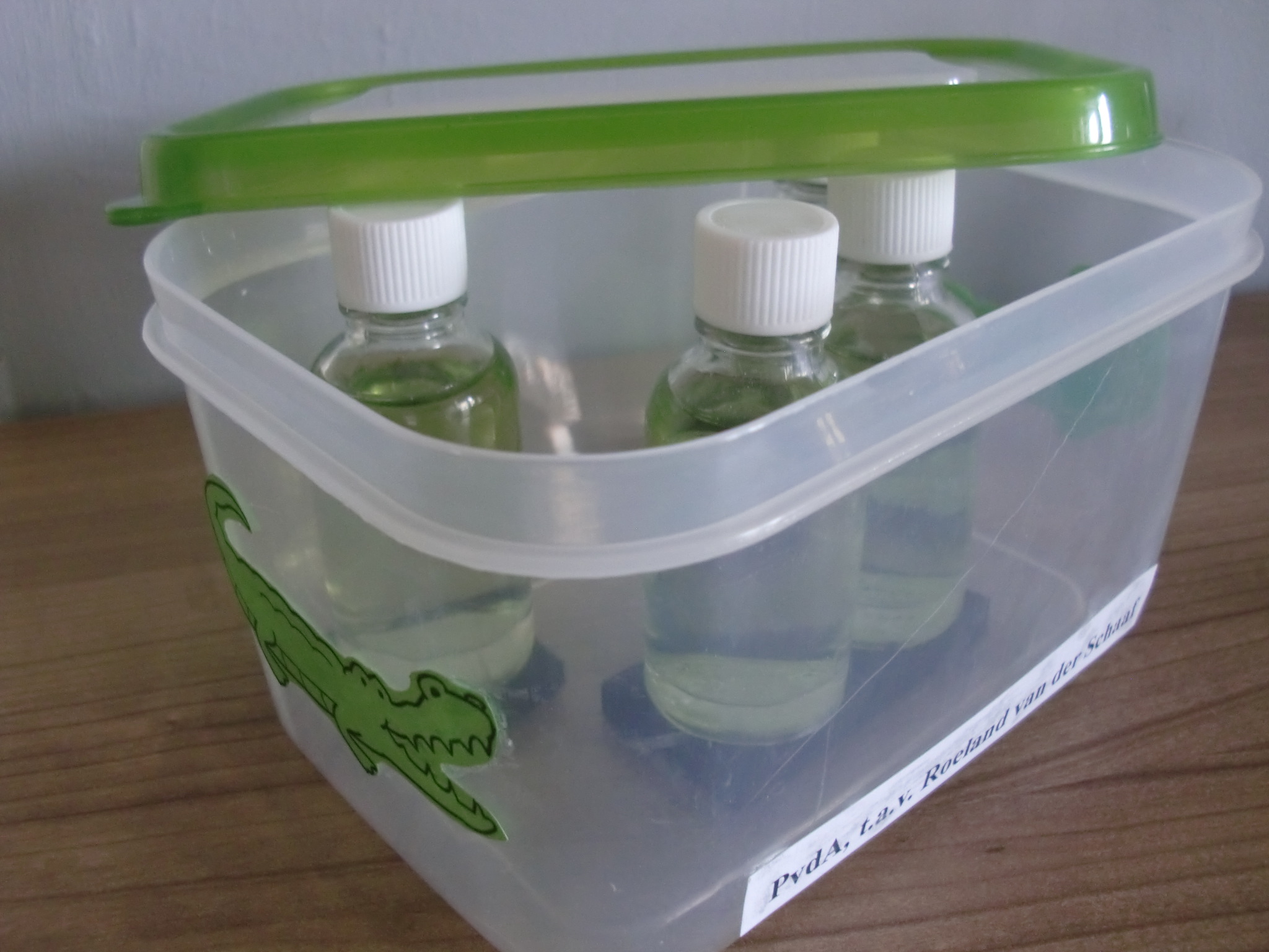 Om zijn verwijt kracht bij te zetten stuurt hij de PvdA lijstrekker een doosje met daarin flesjes gevuld met, denkbeeldige, krokodillentranen. Hij nodigt van der Schaaf ook uit om met hem in debat te gaan.