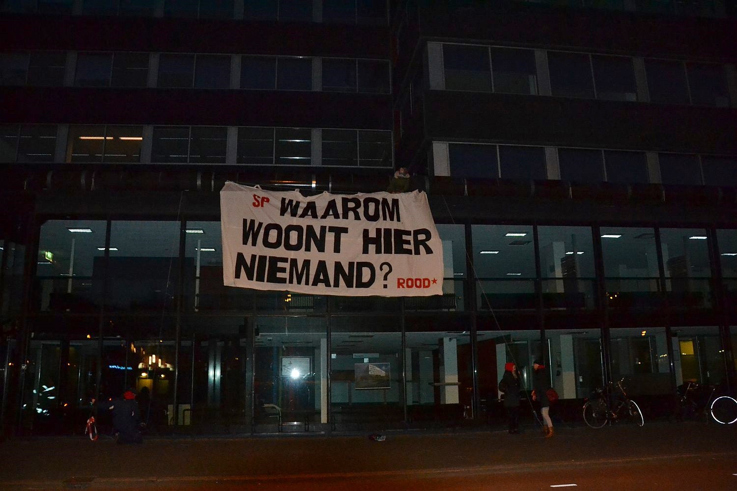 Woensdagochtend hing ROOD, de jongerenclub van de SP, een spandoek aan het oude SoZaWe-gebouw, met de tekst: ‘Waarom woont hier niemand?’
