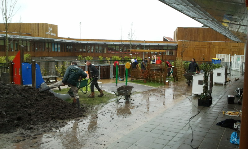 Ondanks de regen zijn bij kinderdagverblijf Kits in de Reitdiepwijk rond de dertig vrijwilligers aan de slag om de tuin op te knappen. Er komt een heuvel met een glijbaan en een kleine moestuin.