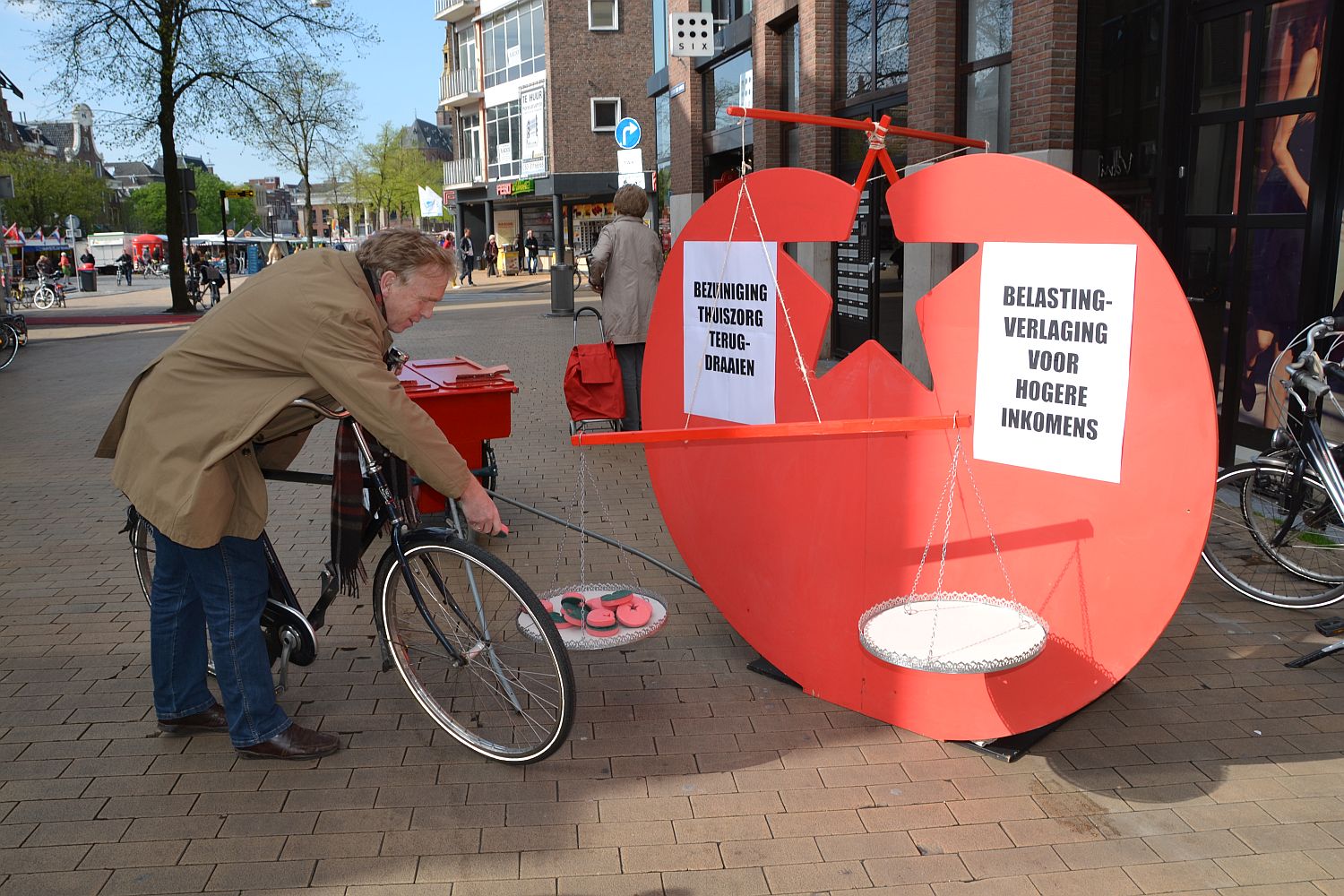 Rood had symbolisch een weegschaal op Tussen Beide Markten geplaatst waarop Stadjers hun oordeel over het plan konden afwegen.