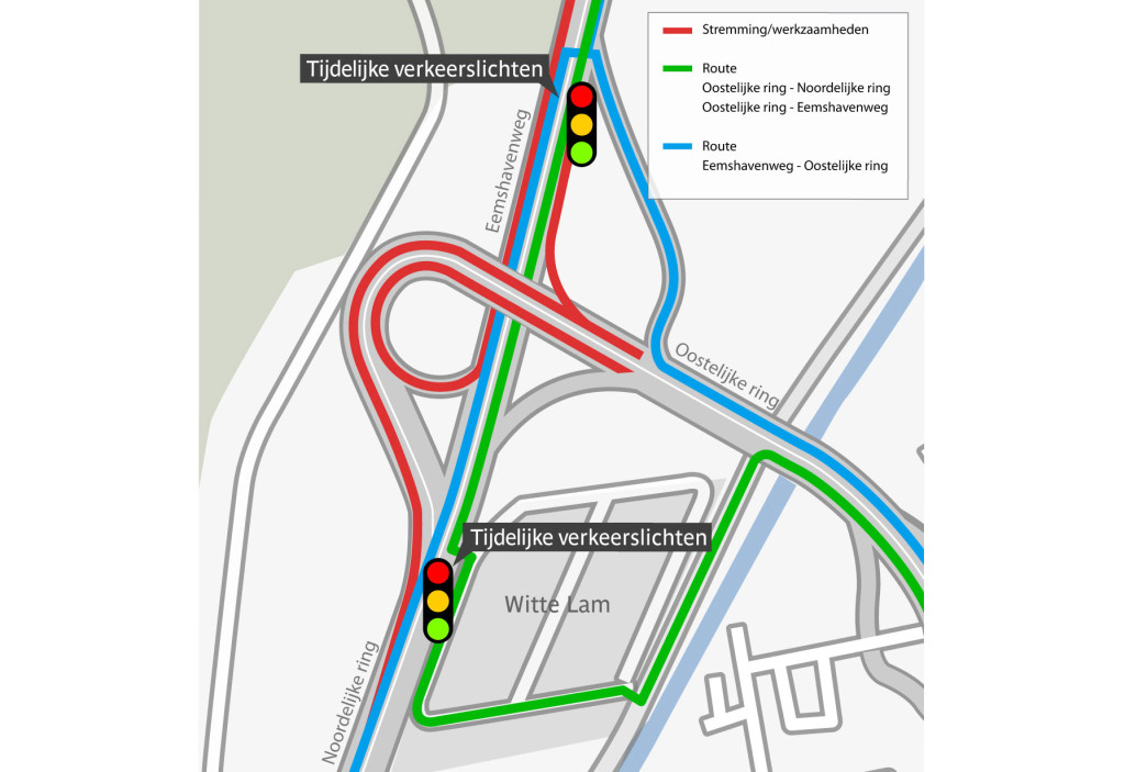 Verkeer dat vanaf de oostelijke ring naar de noordelijke ringweg wil, wordt omgeleid via de Eemshavenweg. Wie vanuit de richting Eemshaven naar de oostelijke ringweg wil, wordt omgeleid via bedrijventerrein Het Witte Lam. Deze omleiding duurt tot zondag 11 mei.