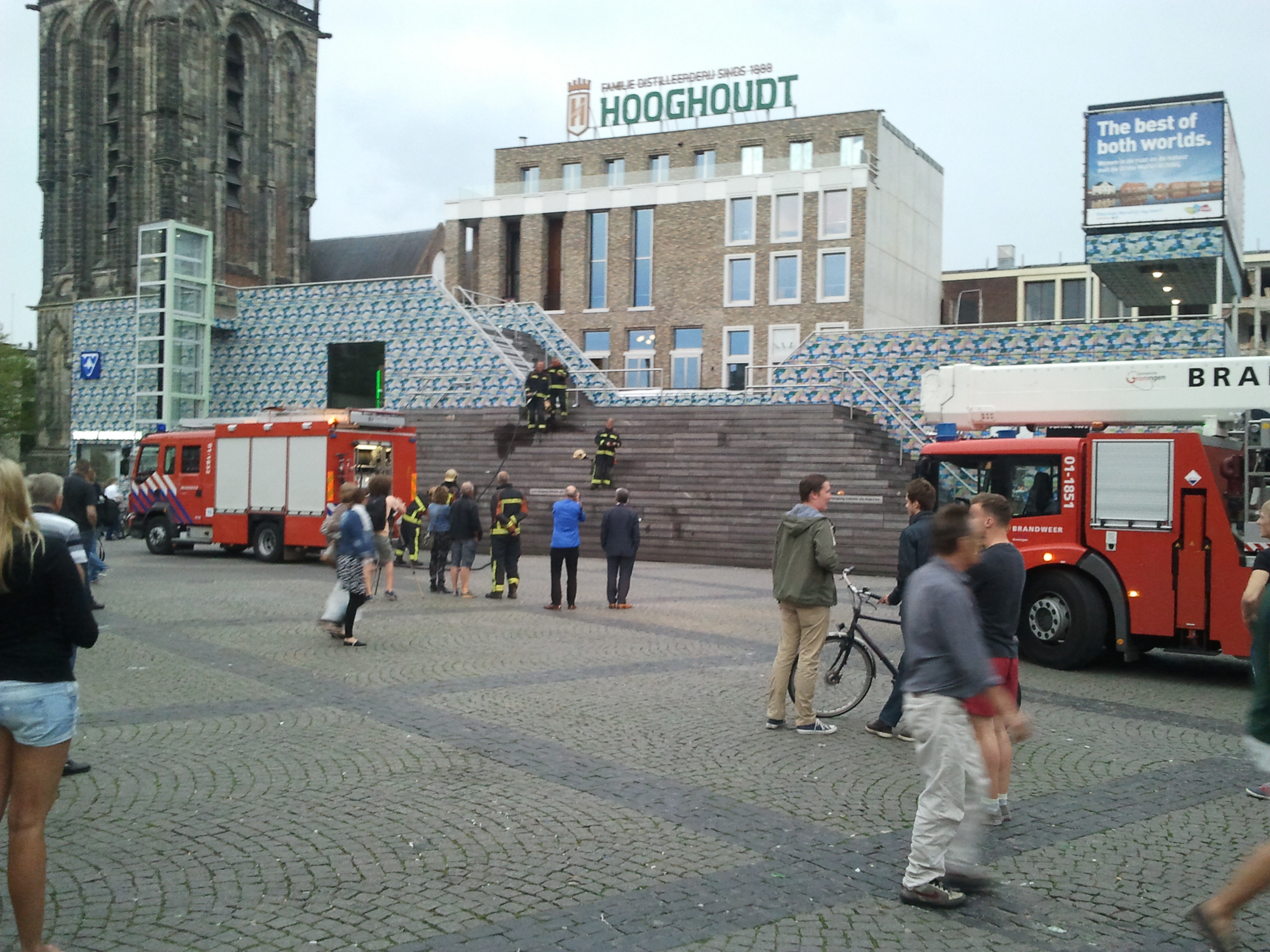 Een kleine brand op de houten trappen van het tijdelijke VVV kantoor op de Grote Markt is zojuist snel geblust.