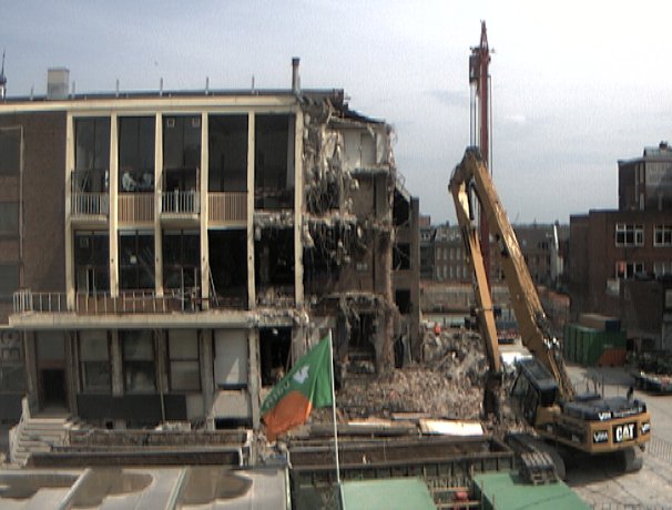 Het oude Vindicat pand wordt gesloopt voor de nieuwe oostwand van de Grote Markt. De studenten zijn inmiddels verhuisd naar een nieuw onderkomen dat naast het oude staat.