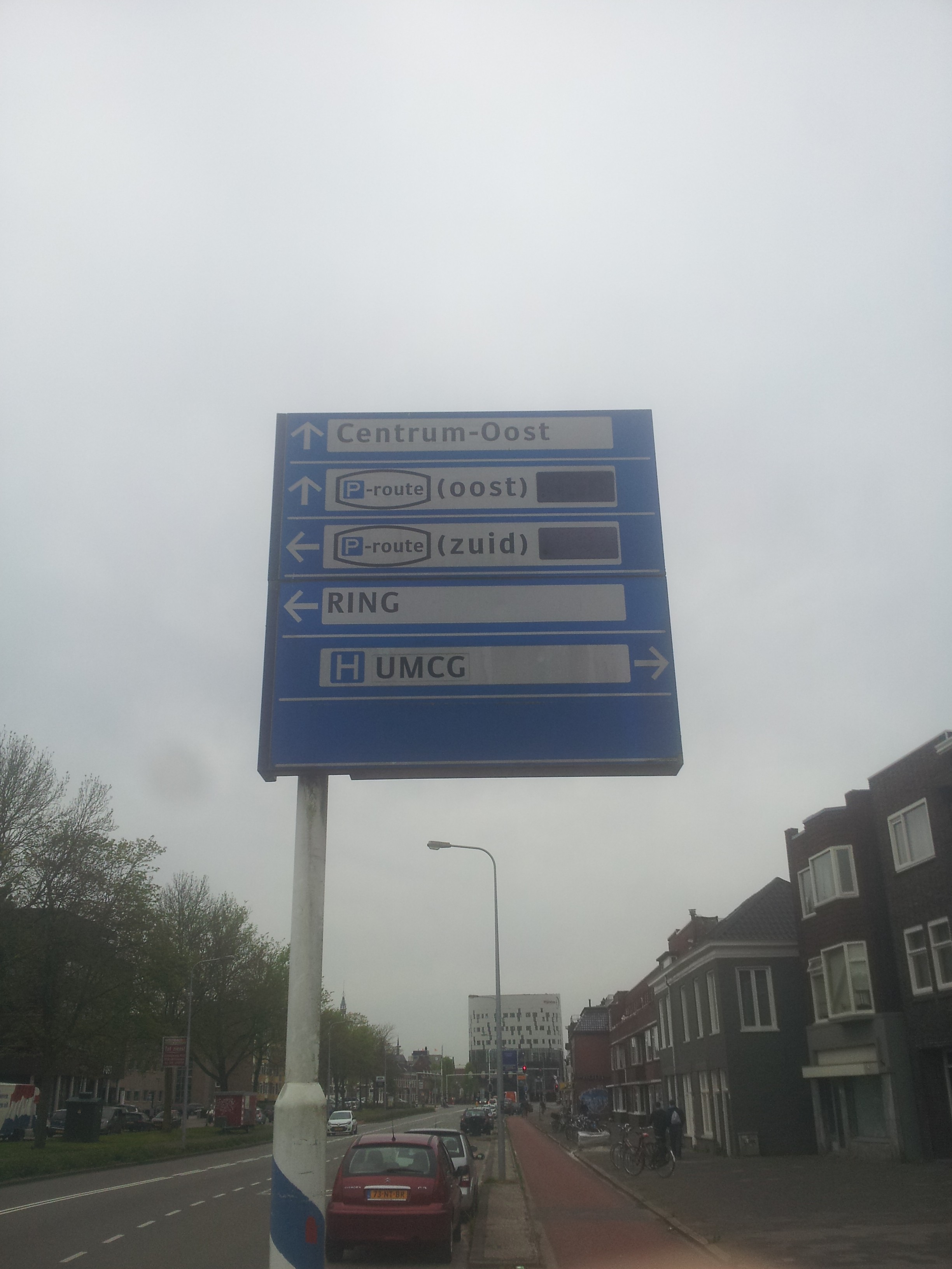 Op het Damsterdiep staat een gloednieuwe parkeergarage. Verkeersborden op datzelfde Damsterdiep verwijzen echter naar Groningen-zuid of -oost. Dat komt omdat het Parkeer Route Informatie Systeem uit 1997 stamt. De nieuwe parkeergarages staan daar nog niet allemaal op aangegeven.