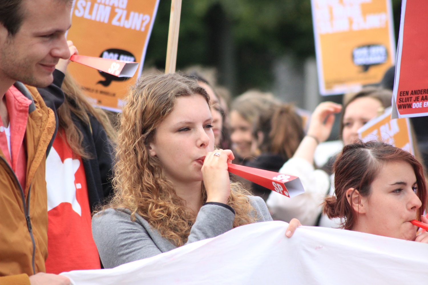 De demonstranten verzamelden zich op het academieplein en trokken vervolgens naar de Ossenmarkt. Daar werden zij toegesproken door studentenvertegenwoordigers en SP Kamerlid Paul Ulenbelt.