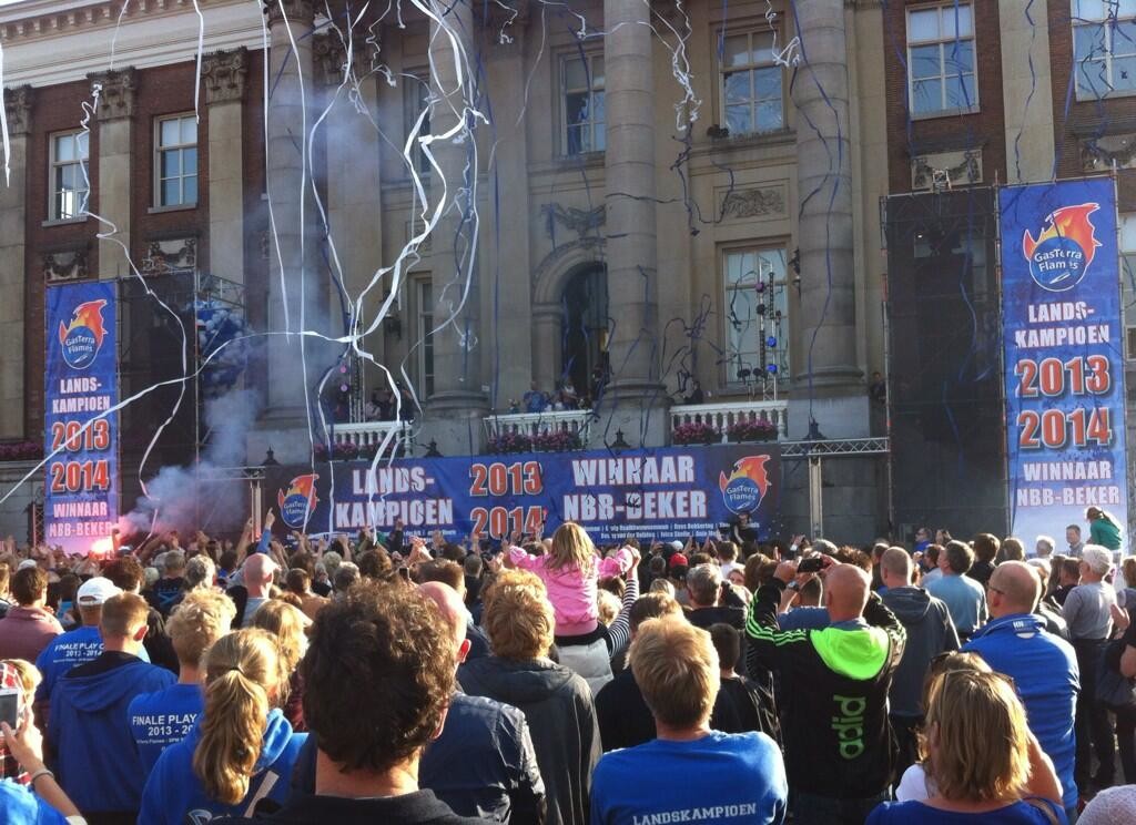 De basketballers van GasTerra Flames werden maandagavond gehuldigd op de Grote Markt. Enkele duizenden mensen woonden het feestje bij.