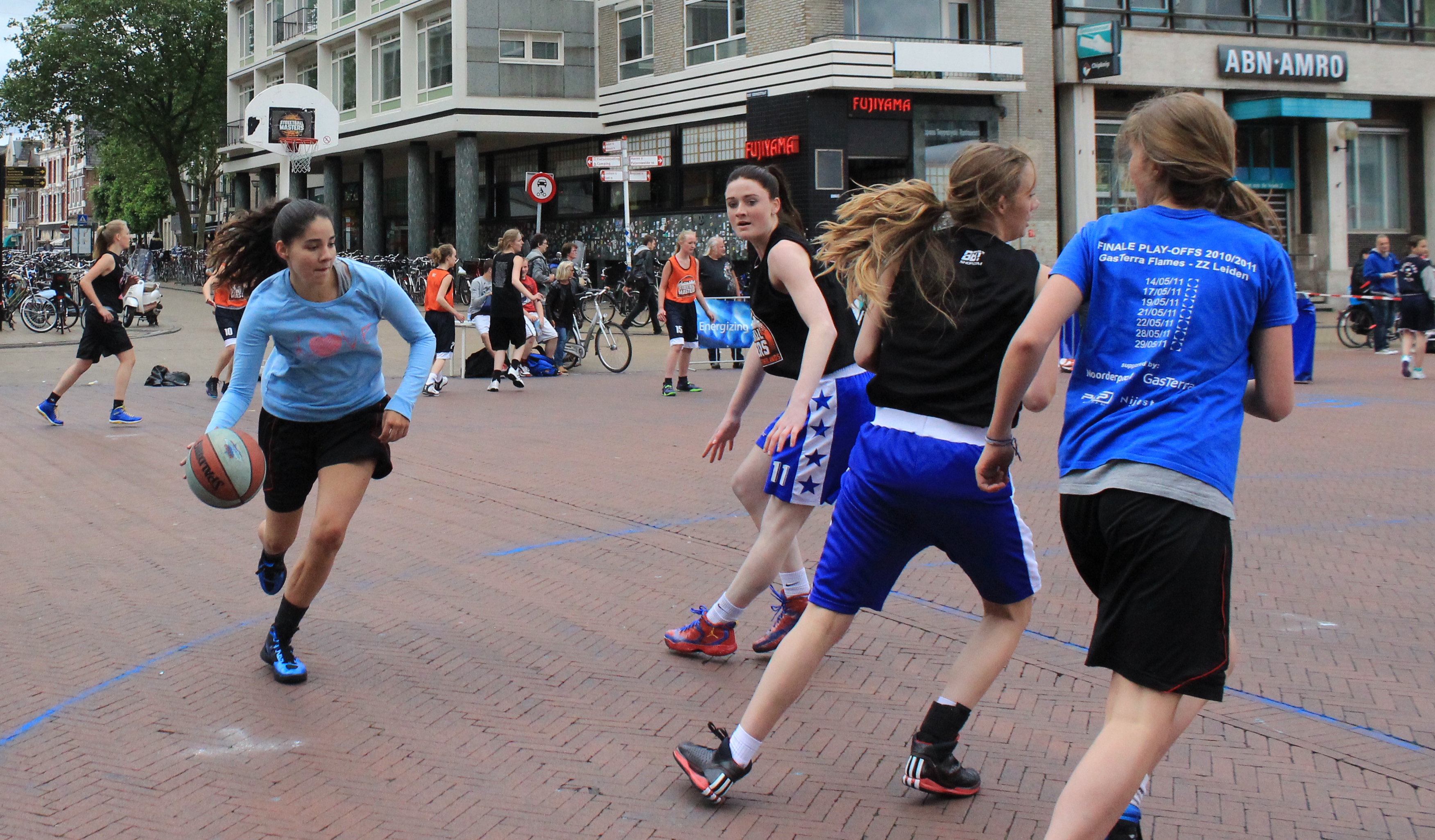 De Grote Markt was zondag het toneel van de Streetball Masters Groningen. De hoofdmoot was een drie tegen drie basketbaltoernooi.