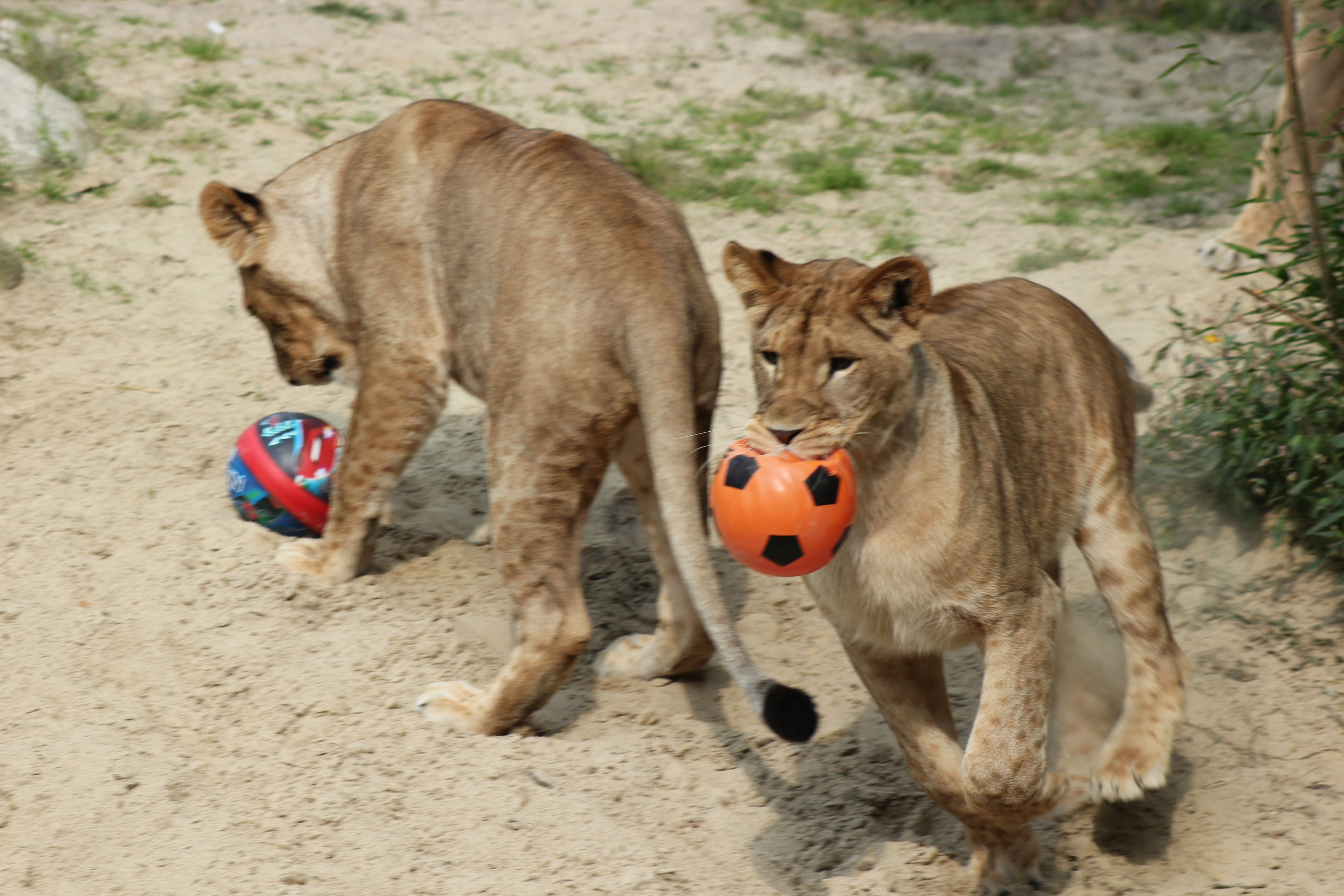 Het personeel gooide twee ballen in de leeuwenkuil. Een gekleurde en een oranje bal.