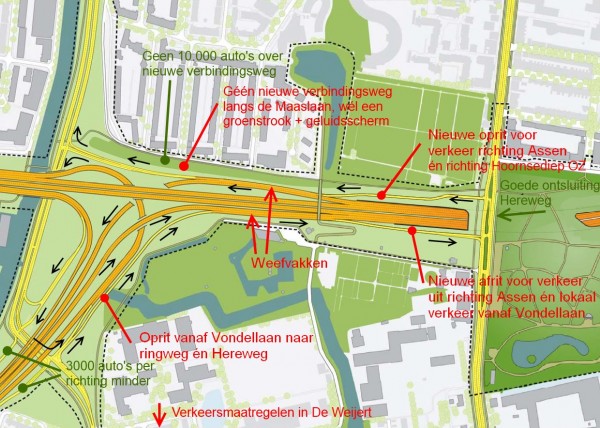 Kamminga wilde een afslag op de ringweg bij de Hereweg, die zou de verkeersdrukte op de Vondellaan en de Maaslaan ontlasten. Pas deze week kwam het stadsbestuur met een definitieve reactie: Te duur, niet effectief en er zou vertraging ontstaan in de aanleg van de ringweg. Partijen die eerst voor de Kammingavariant waren trokken hun steun in dit tot grote teleurstelling van Kamminga en de oppositie: ” Die argumenten hadden we wel eerder willen horen.” De variant werd woensdagavond verworpen. Moties voor geluidsarm asfalt bij Hoogkerk en een verzoek aan de minister om een maximumsnelheid van 80 km per uur haalden het wel.