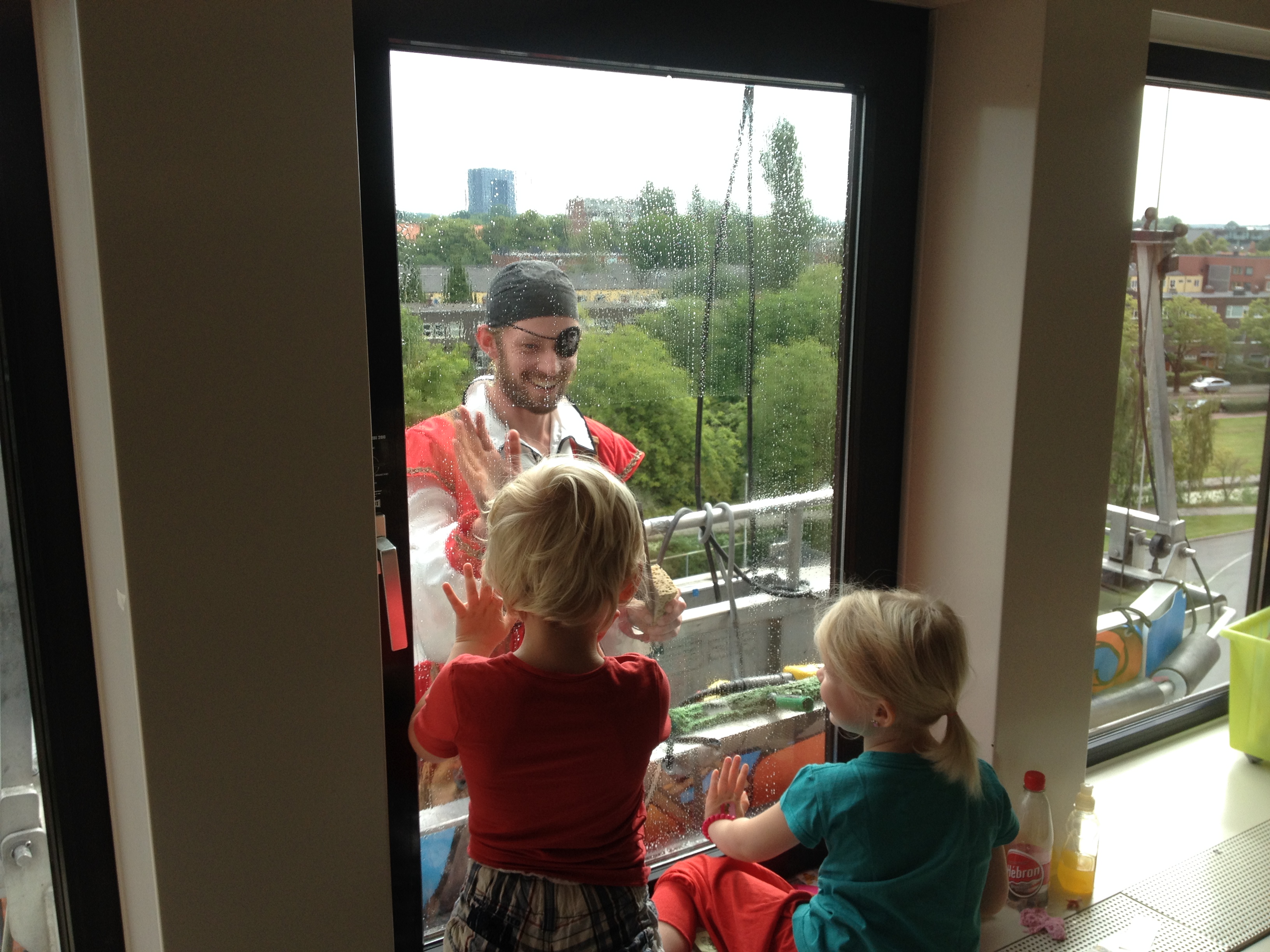 Een bijzonder gezicht was het donderdag voor de patiëntjes van het Beatrix Kinderziekenhuis. In plaats van de glazenwasser kwam er een piraat in bijbehorend schip langs om de ramen schoon te maken.