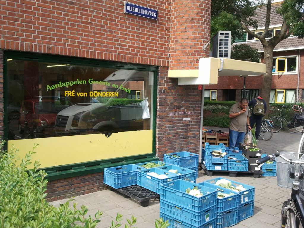 Bij de winkel van Fré van Donderen, op de hoek van de Hortensialaan en de Oliemuldersweg is het net als vaak weer erg druk. Mensen zoeken koopjes maar dat valt toch een beetje tegen.