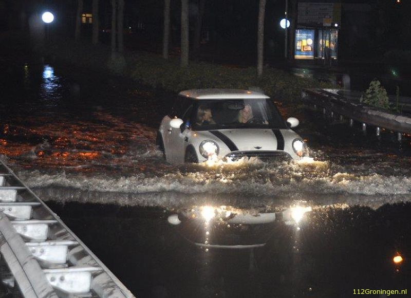 De weg onder het Noorderstation stond dinsdagavond enige tijd blank. Grote hoeveelheden water door de vele regenval maakten het doorrijden voor automobilisten en fietsers lastig.