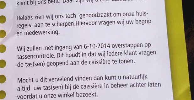 Bij de deur staat: wil je wat stelen, stop het dan niet in een tas. Je vangt er geen dief met zo'n papiertje bij de ingang.