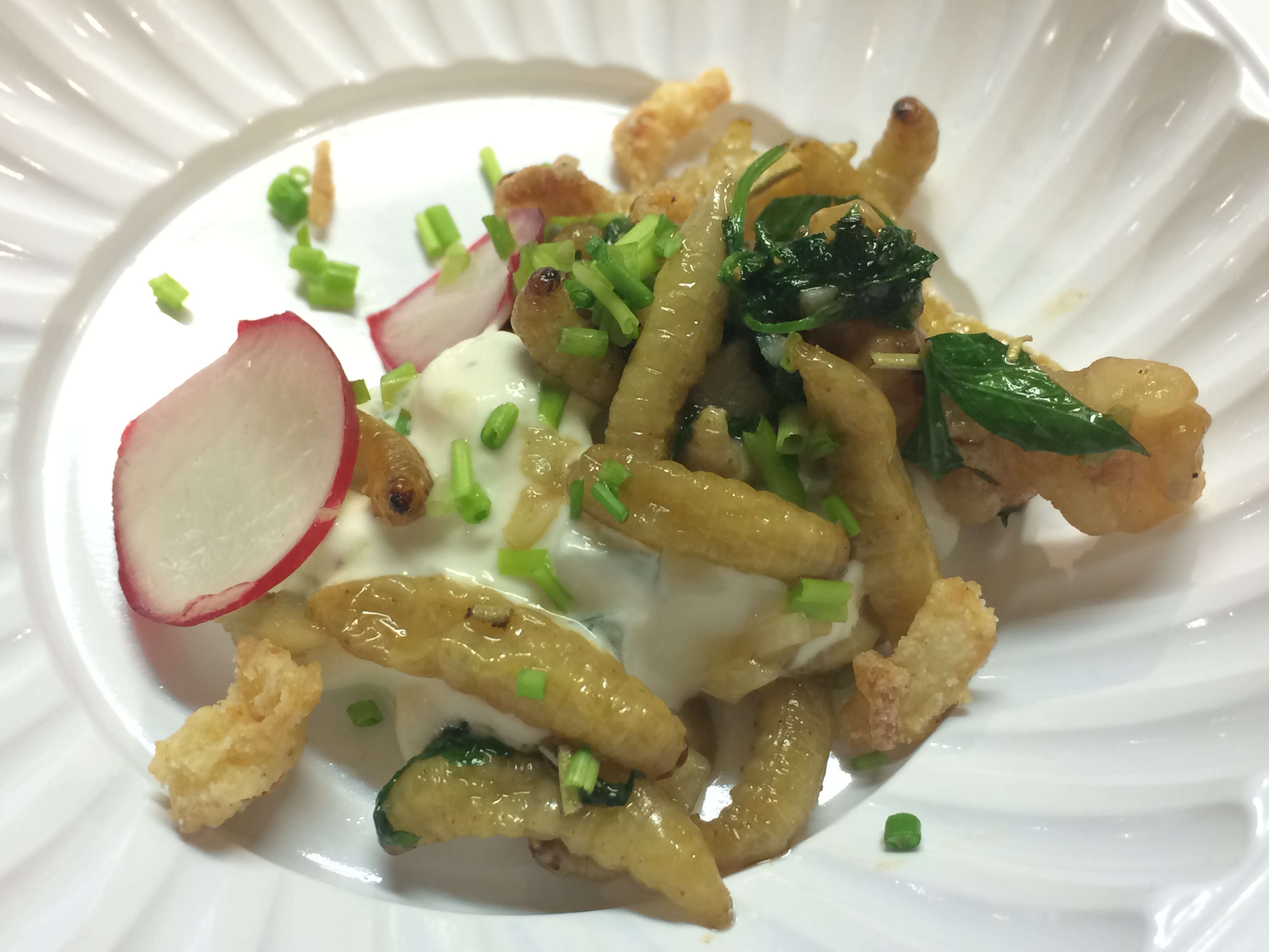 Bitterballen met meelwormen, een burger van buffalowormen en knapperige wasmotlarven met zout en paprika. In de kookstudio van de Jumbo Euroborg konden klanten vandaag de proef op de som nemen.