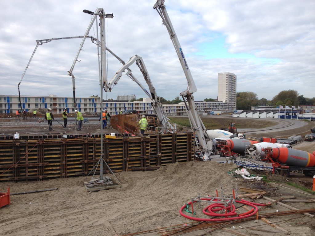 In totaal rijden er vanaf de Eemshaven 110 vrachtwagens met beton. Het beton wordt meteen op de juiste plekken gestort.