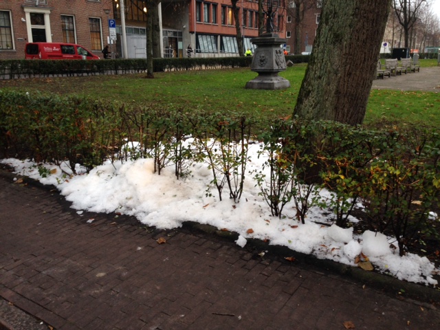 Op het Guyotplein bij de rechtbank ligt woensdagmorgen een hoopje sneeuw. Het witte goed zal niet uit de lucht gekomen zijn, maar hoe het wel op het plein is gekomen, is voorlopig nog een raadsel.