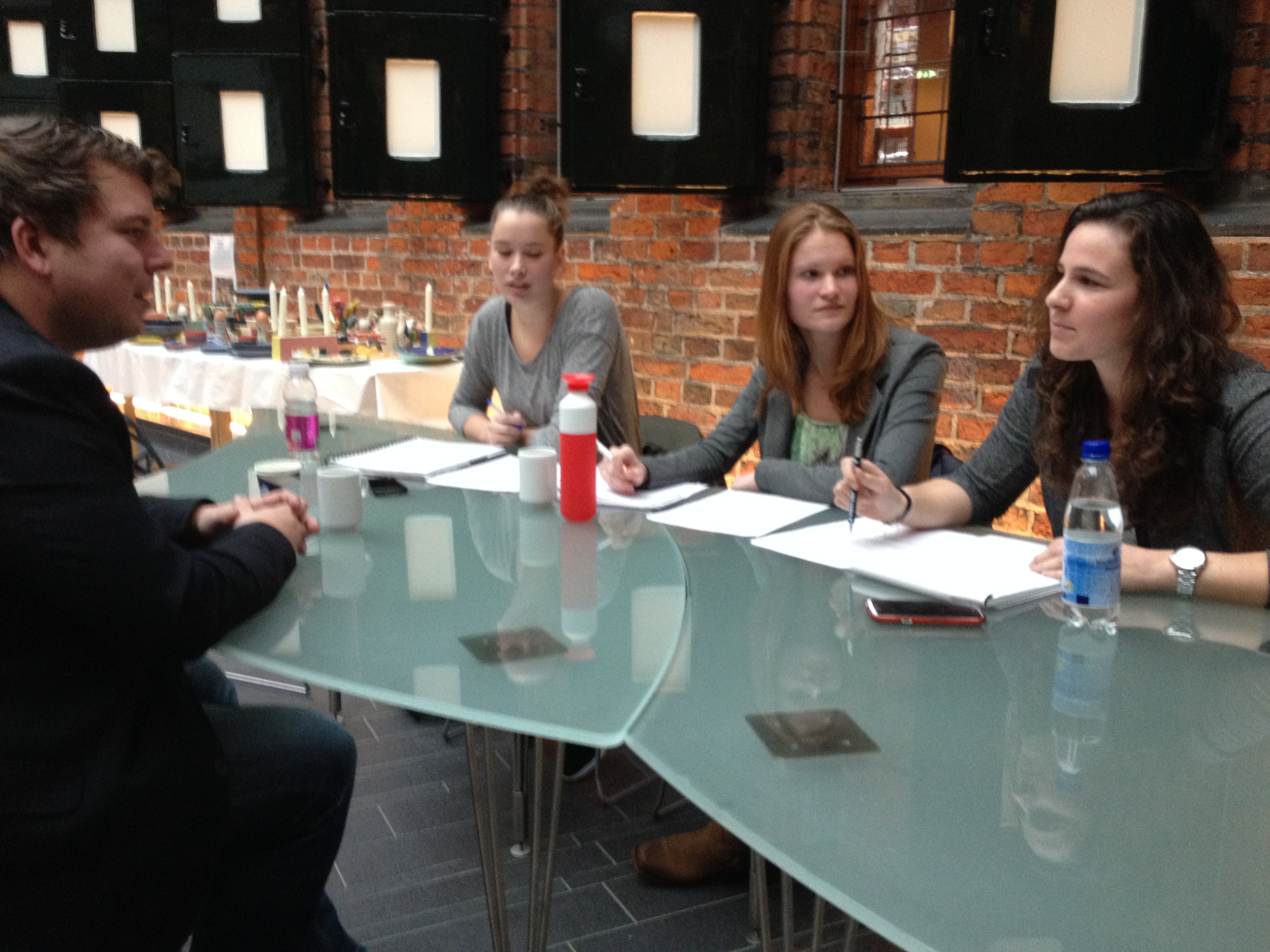 Leerlingen van het Bonaventura College uit Leiden interviewen fractievoorzitter Tim Zwertbroek (D66) - foto: Sebastiaan Scheffer