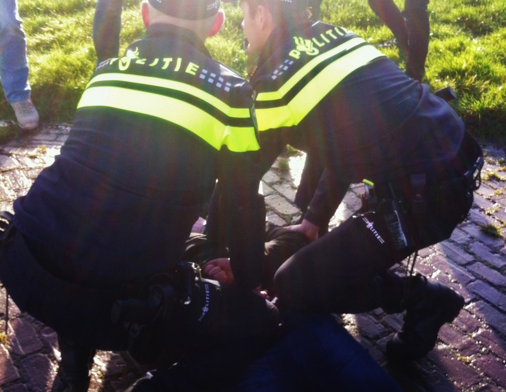 Bij een vechtpartij in de Oosterstraat zagen agenten dat een man iets naar omstanders gooide. De man ging er vandoor en sloeg een 21-jarige omstander uit Ureterp tegen het hoofd, toen die hem wilde tegenhouden.