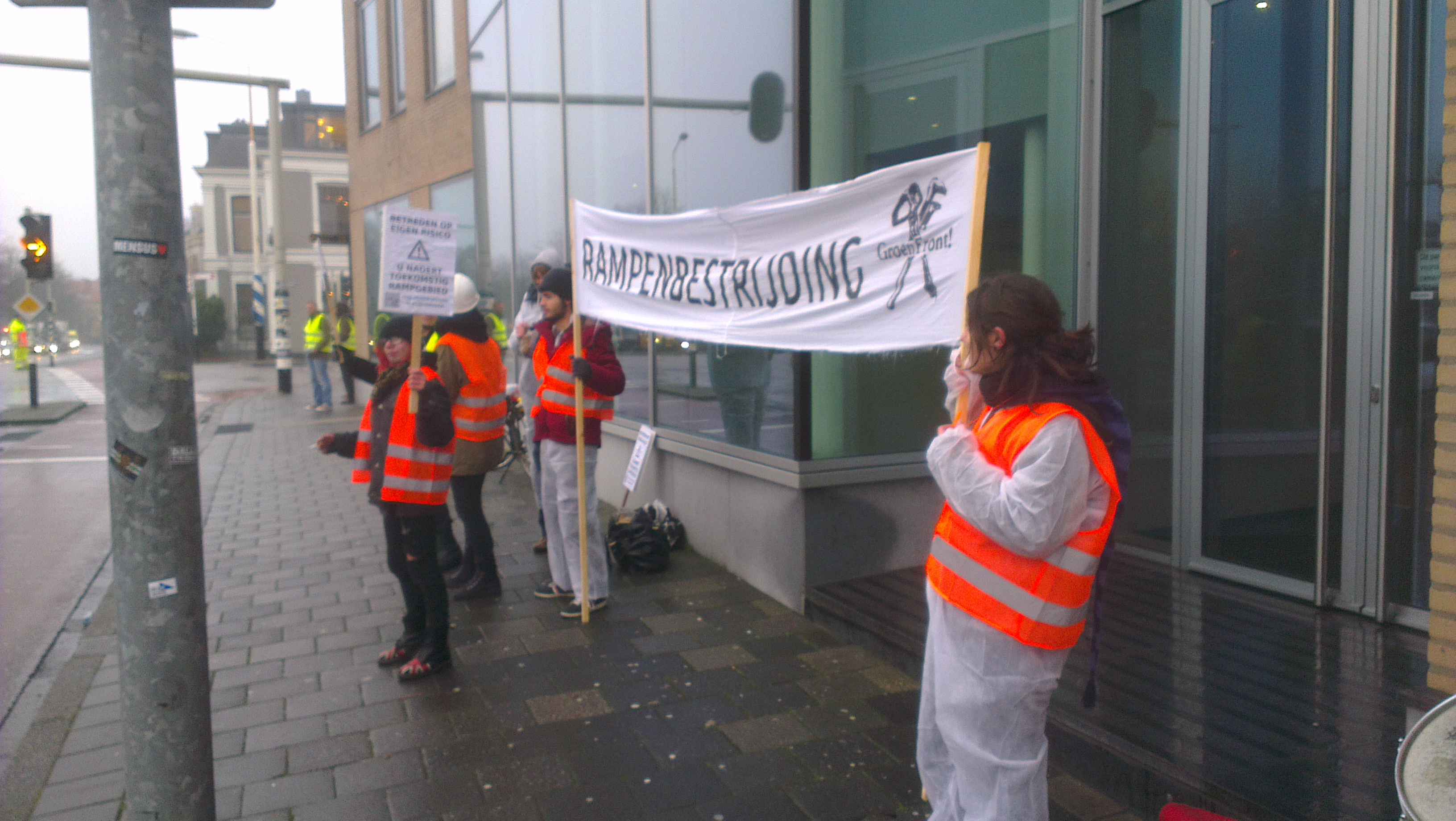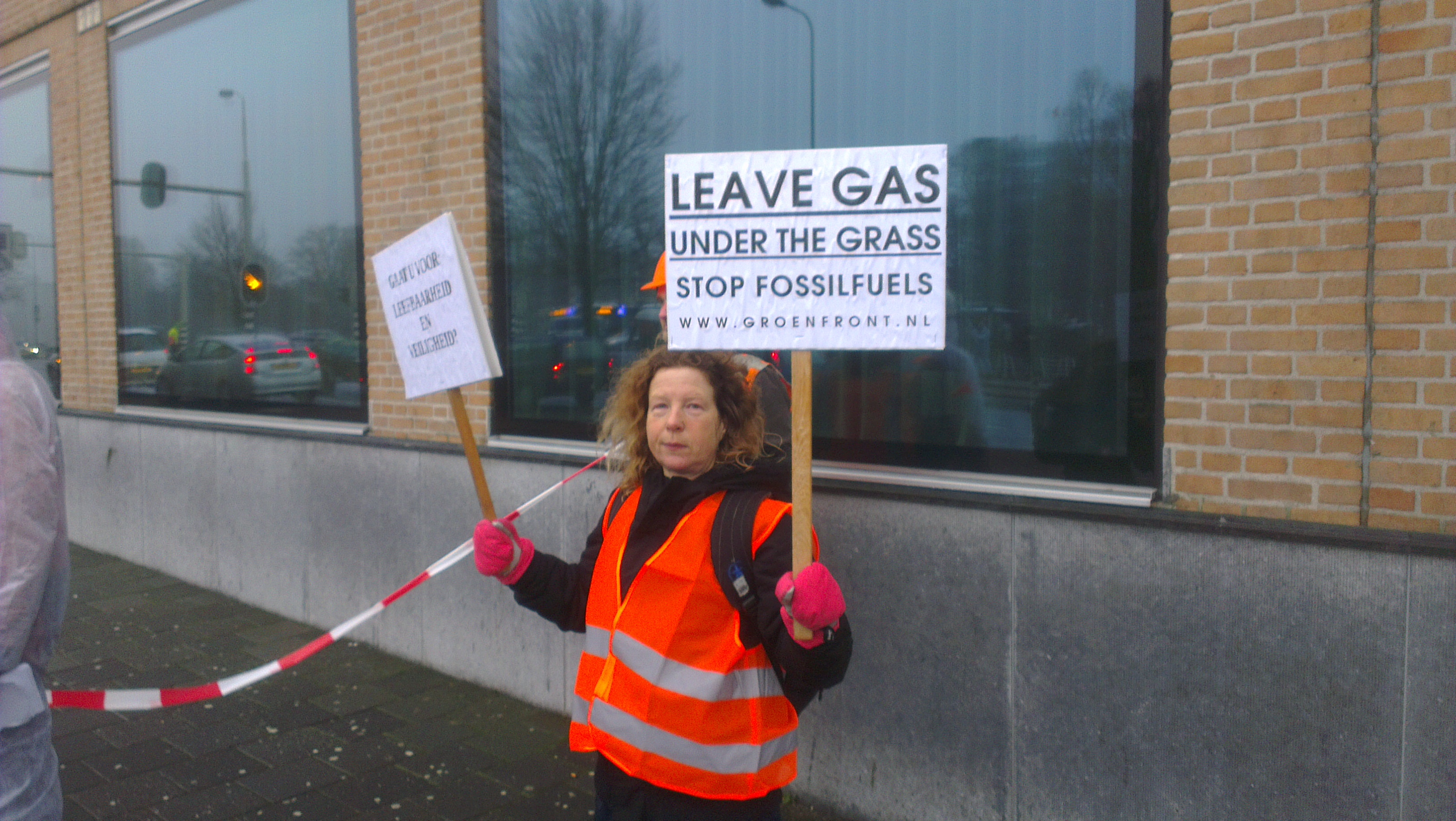 GroenFront voert maandag actie bij het gebouw van GasTerra aan de Stationsweg. GroenFront ziet GasTerra als een van de verantwoordelijken voor de aardbevingen in Groningen.